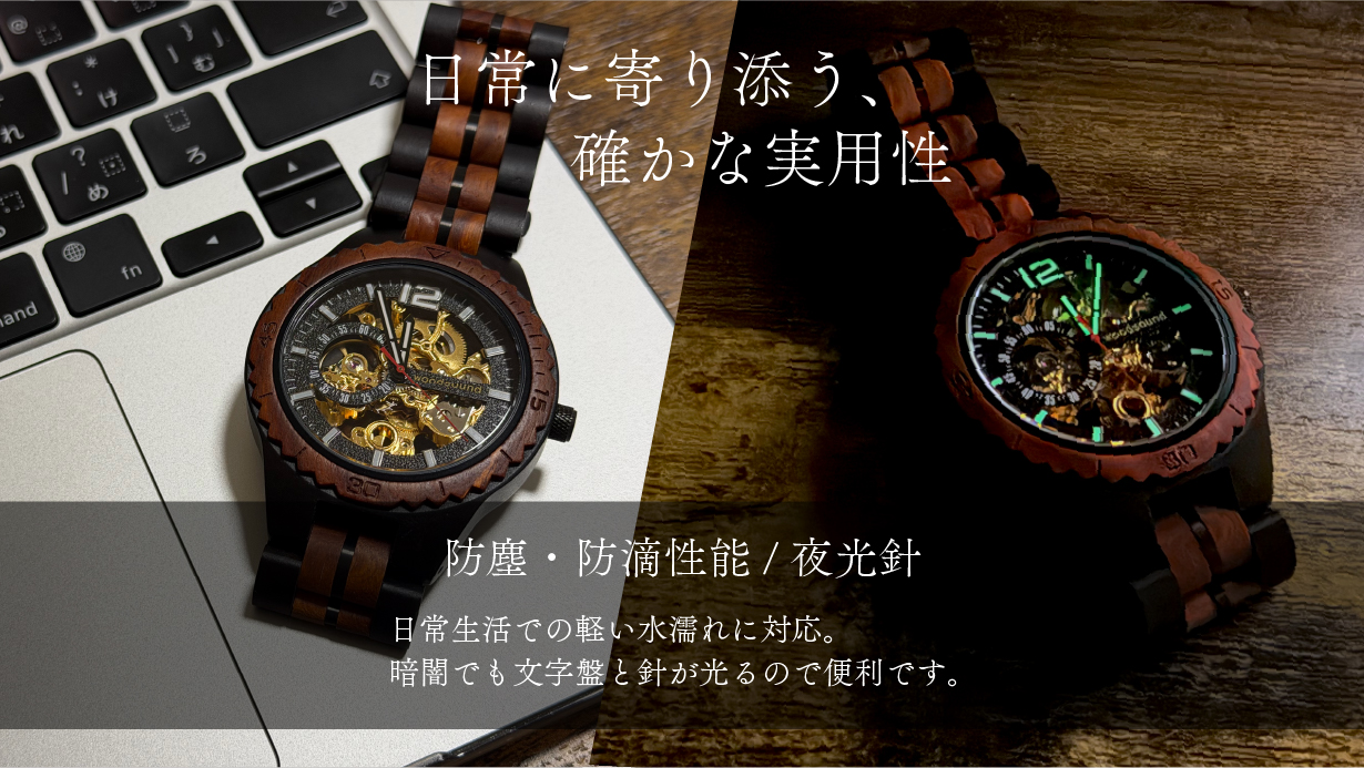 防塵・防滴性能:木製腕時計ですが、突然の雨や洗顔時の水しぶきにも安心な防滴仕様です。