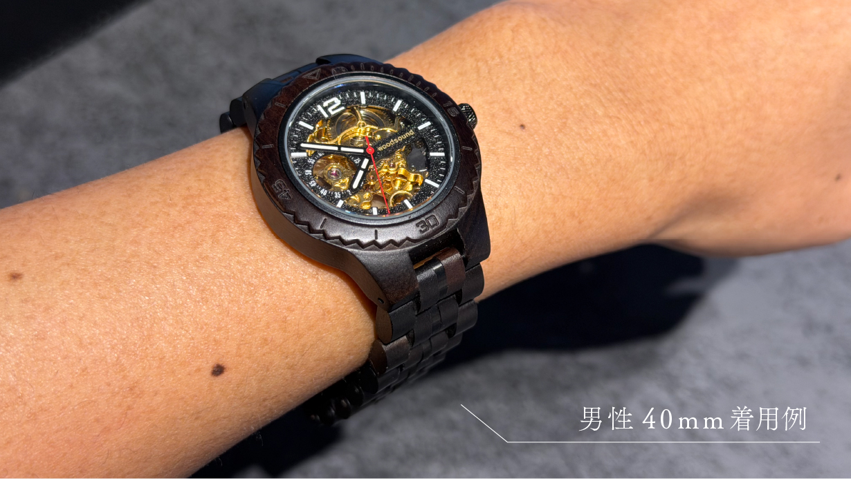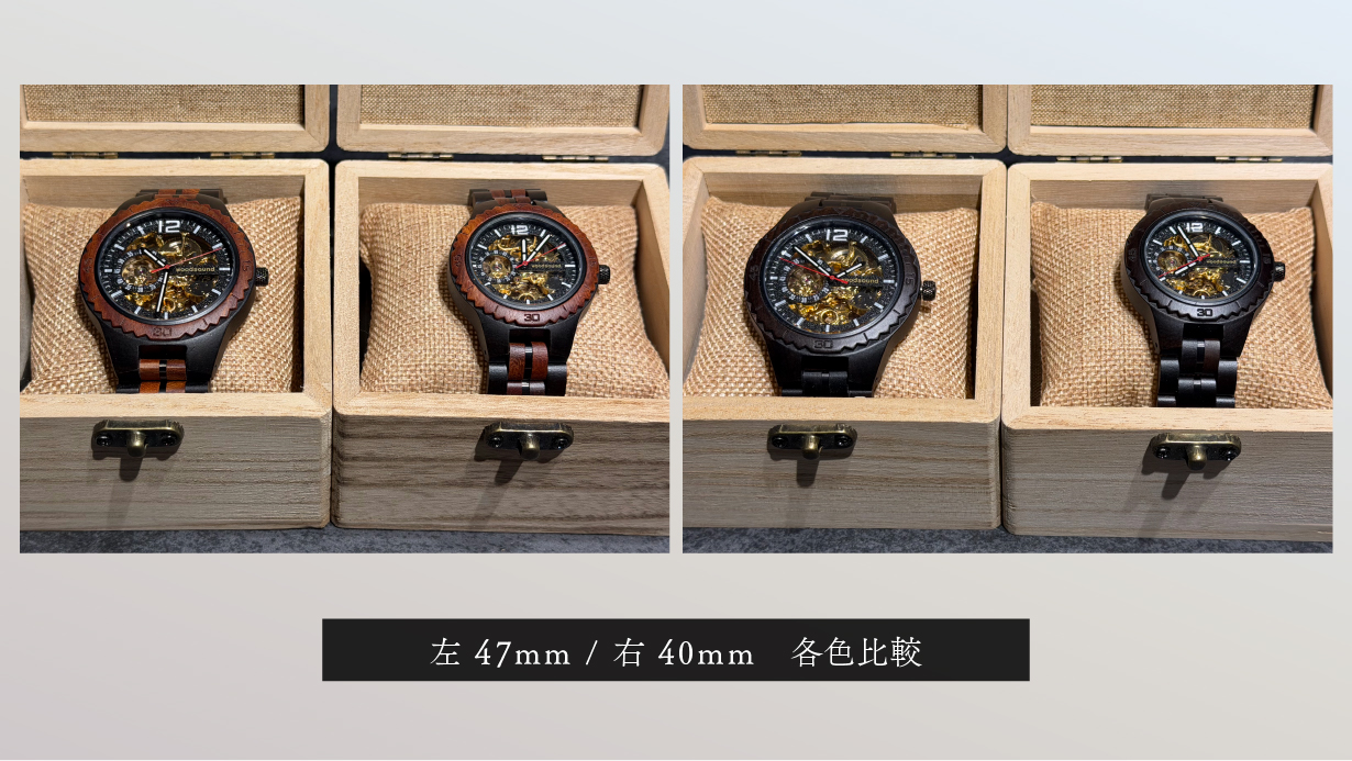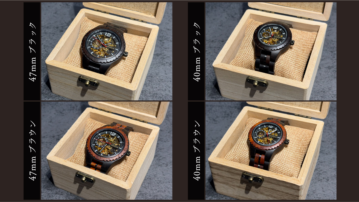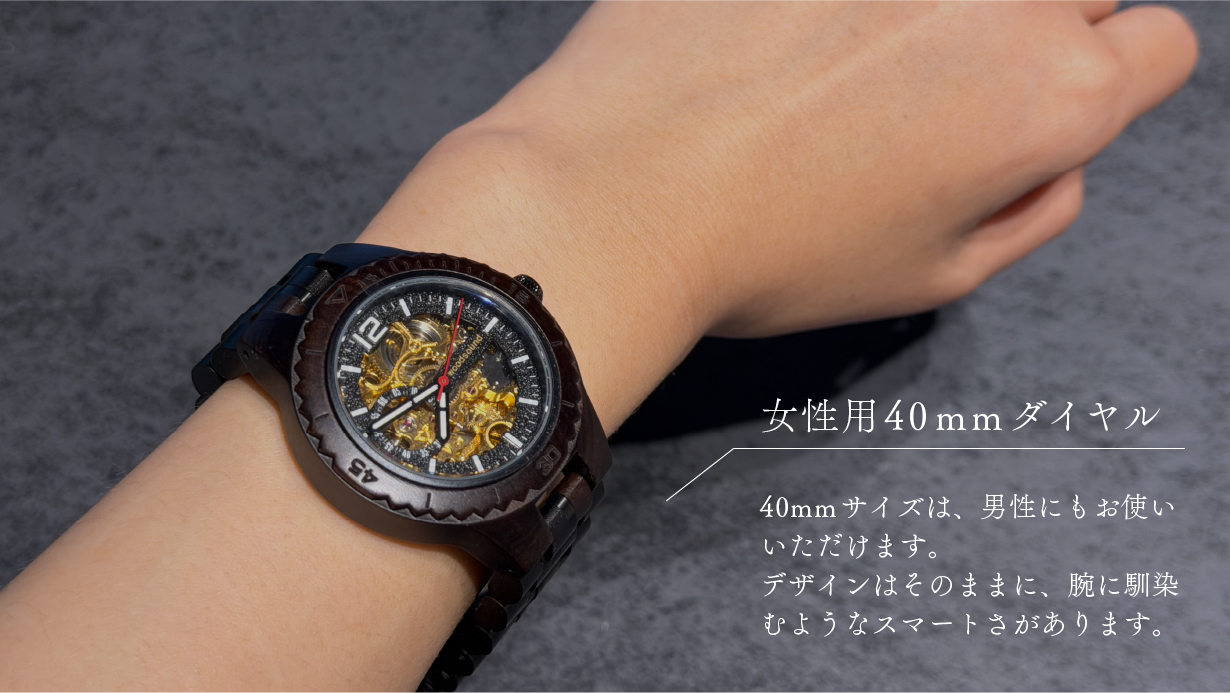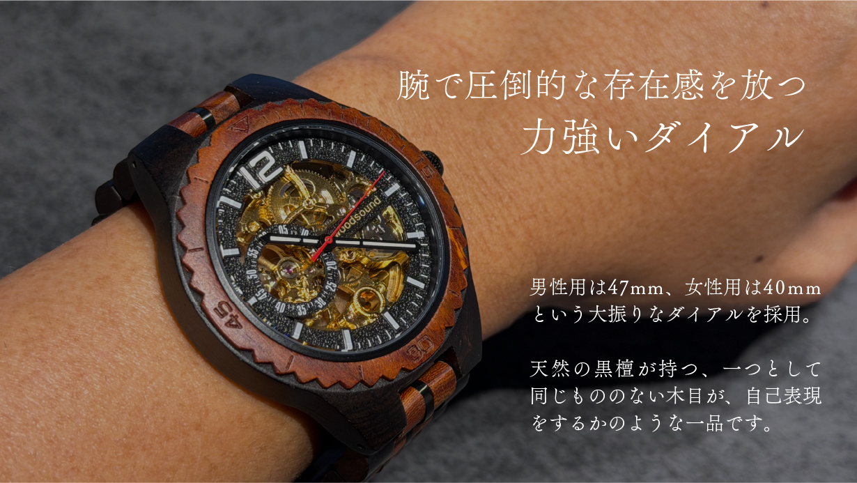 男性用は47mm、女性用は40mmという大振りなダイアルを採用。天然の黒檀が持つ、一つとして同じもののない木目が、あなたの個性を雄弁に語ります。見る角度によって表情を変えるその様は、まさに"生きた芸術"です。