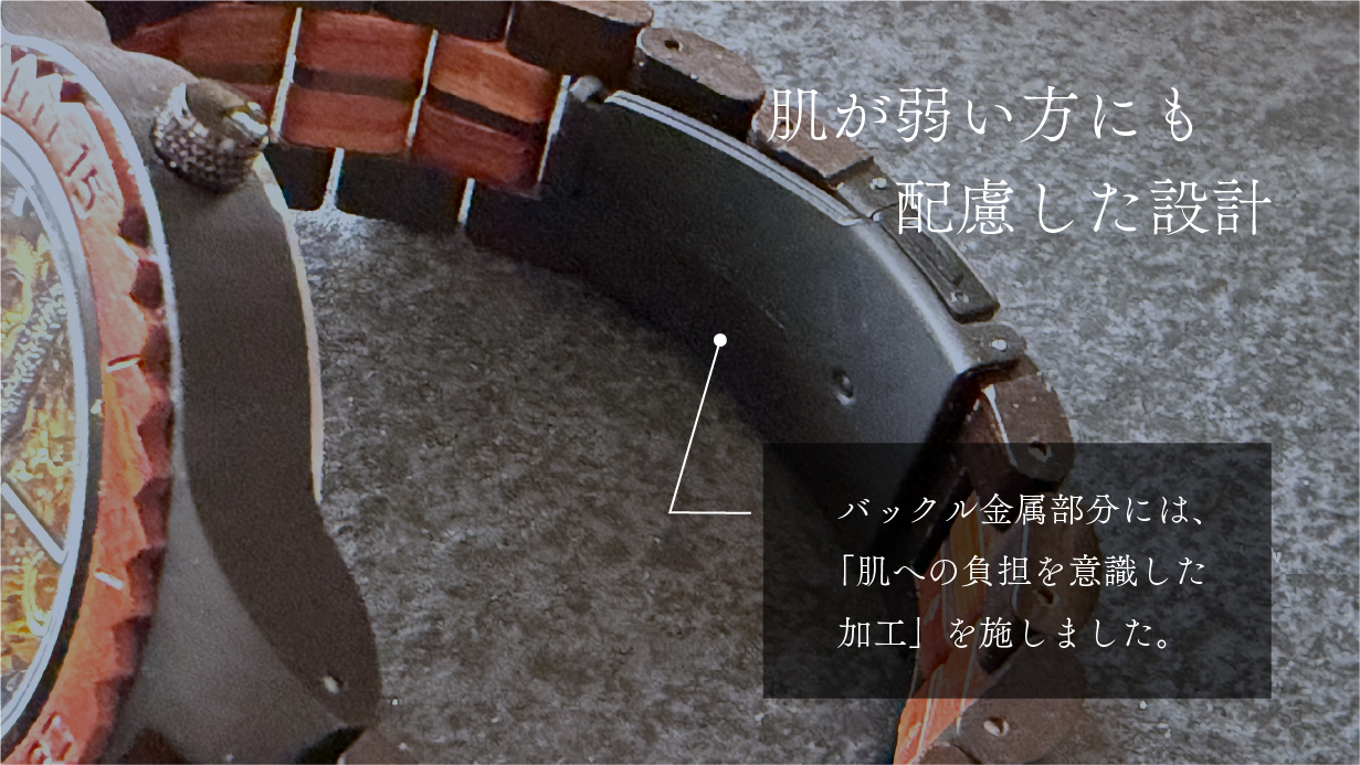 本製品は、直接肌に触れるバックルにまで「肌への負担を意識した加工」を施し、「木だから心配いらない」で終わることのない徹底した配慮を実現しました。