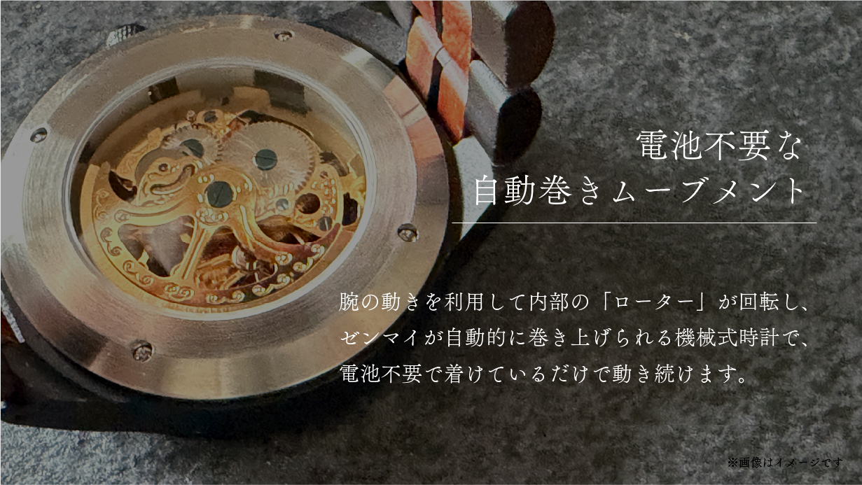 腕の動きを利用して内部の「ローター」が回転し、ゼンマイが自動的に巻き上げられる機械式時計で、電池不要で着けているだけで動き続けるのが特徴です。あなたの腕の自然な動きでゼンマイが巻き上げられ、時を刻み続けます。