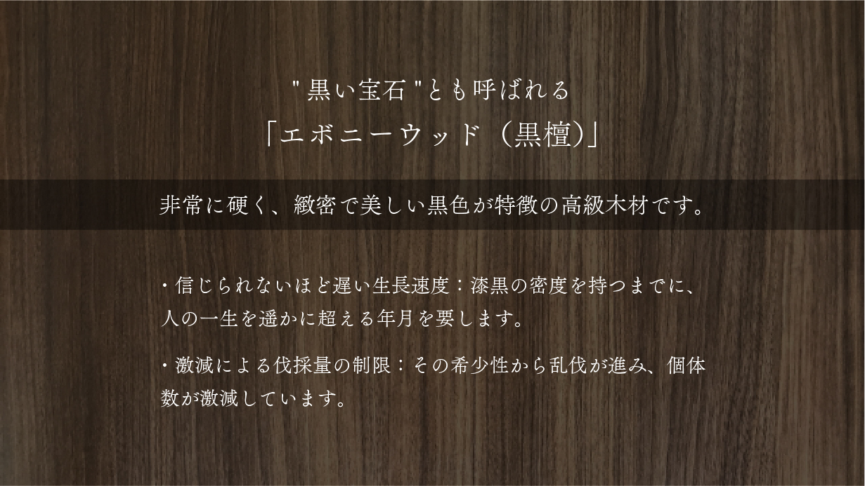 地球が生んだ奇跡のかけら。この希少な黒檀の魅力を限界まで引き出すため、私たちは細部にまで魂を込めました。