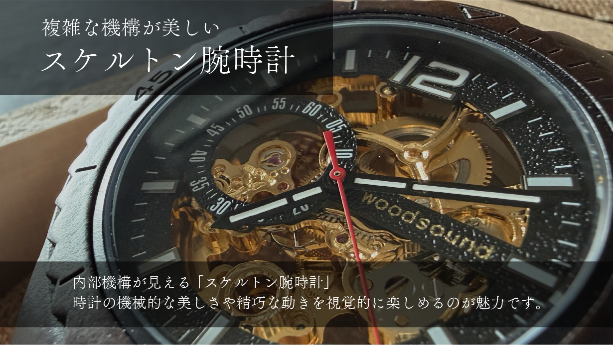 自動巻きは電池式よりも構造が複雑です。本製品は、その複雑な機構を活かした、内部が見えるスケルトンウォッチに。時計の機械的な美しさや精巧な動きを視覚的に楽しめるのが魅力です。