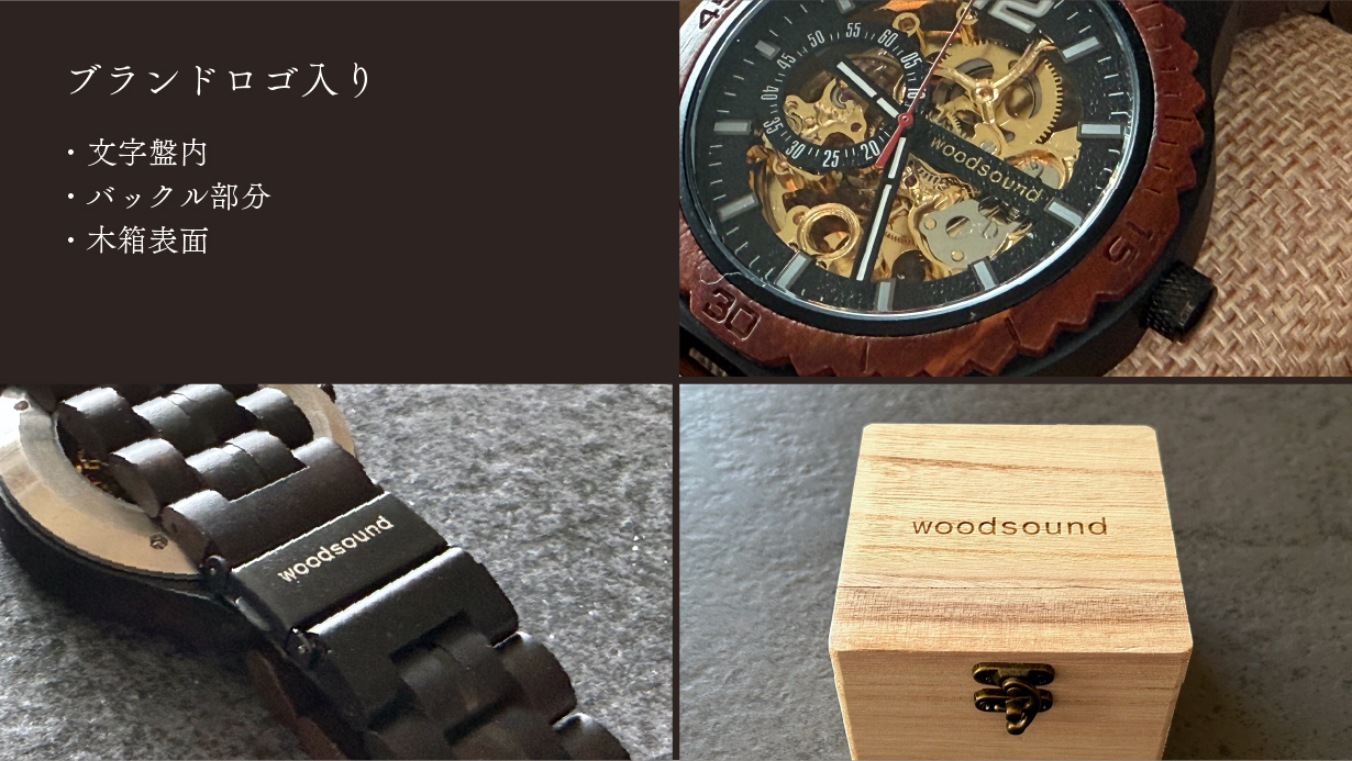 腕時計の文字盤内、バックル、木箱の蓋の計4箇所に「woodsound」のロゴが入っています。文字盤のロゴはゴールドで高級感があります。