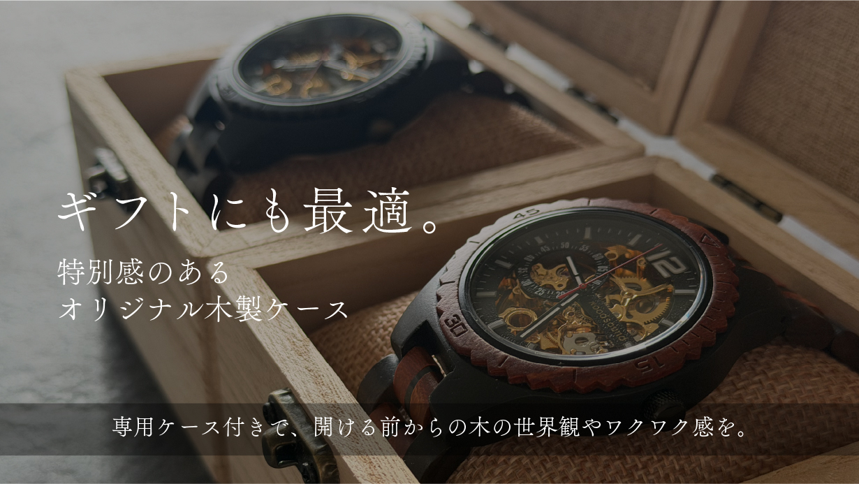 木製腕時計に合う木製の特製ケースに入れてお届けします。開ける前からの木の世界観や、ワクワクを感じていただければ嬉しいです。