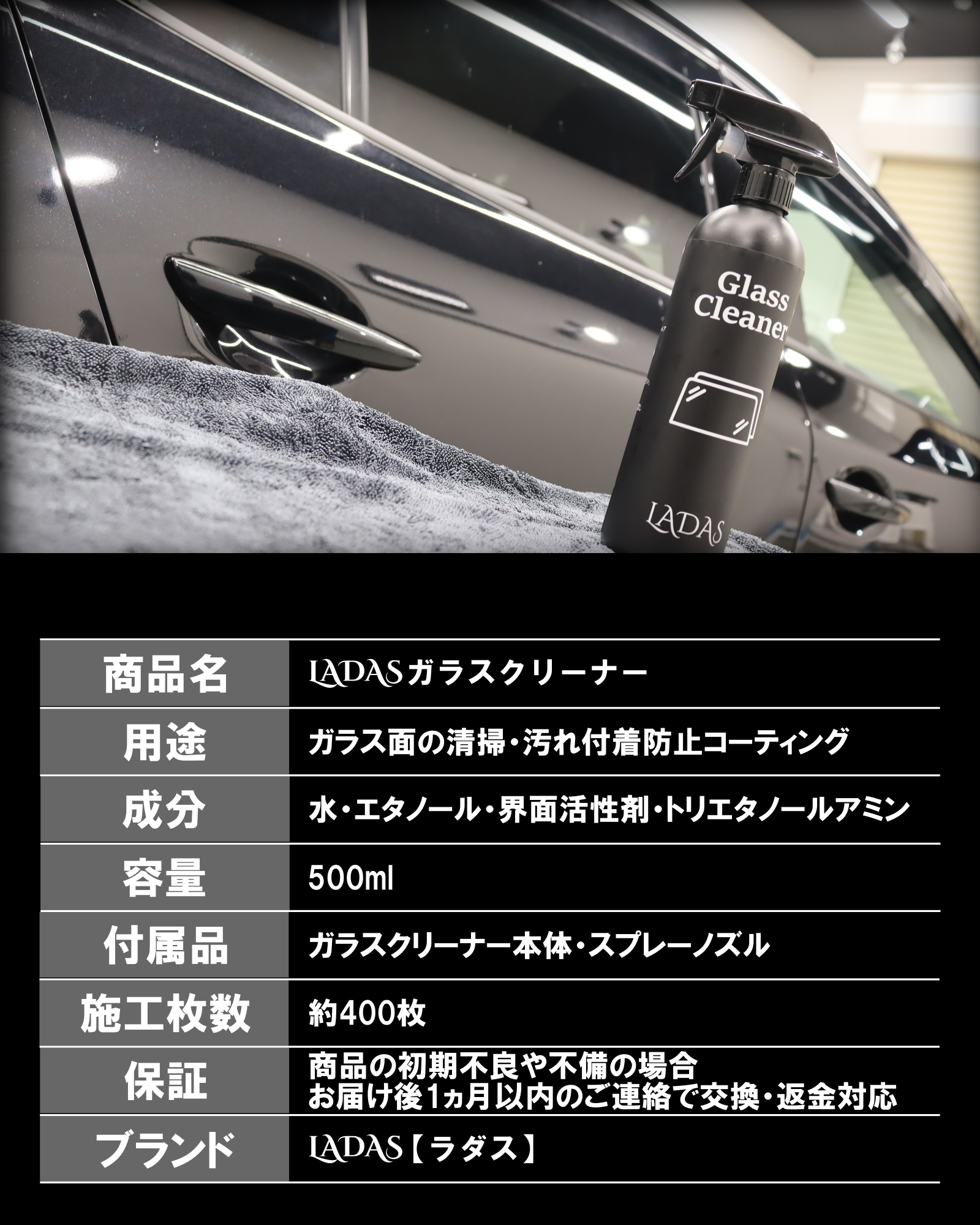 今回ガラスクリーナー発売記念といたしまして、LADASガラスクリーナー専用タオルを付属いたします!