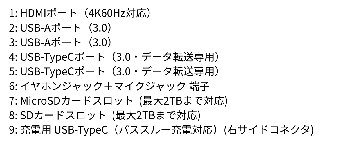 ※HDMIポート使用時はお使いのPCのUSB-CポートがDisplayPort Alt Modeに対応している必要があります。一部のPCでは30Hzまでの対応となる場合があります。