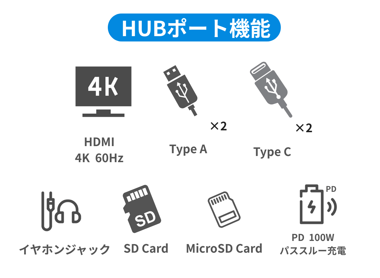 ※HUB機能利用時はTypeCケーブルで左側コネクタ(USB-TypeC)とPCを接続します。