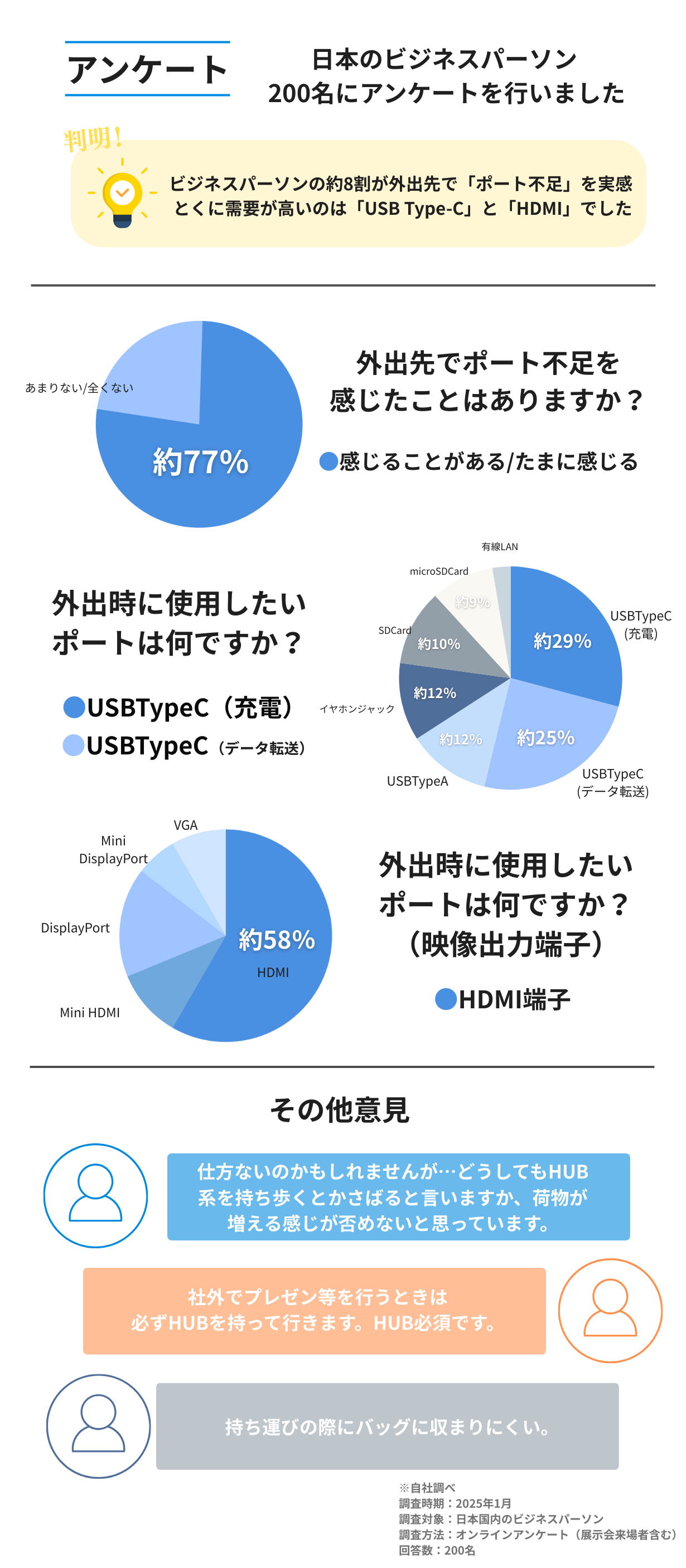 アンケートの結果、USB Type-Cでの接続・充電のニーズが特に高く、USB Type-Aの利用やHDMIでの映像出力にも多くの声が寄せられました。