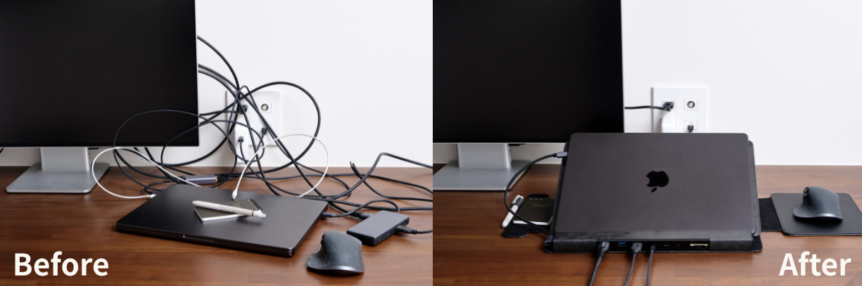 仕事柄、海外展示会や出張の機会が多く、日常的にノートPCを持ち歩きながら仕事をしてきました。しかし外出先では、「スタンドがない」「ポートが足りない」「HUBを忘れた…」といった、小さな不便が積み重なることを何度も経験してきました。