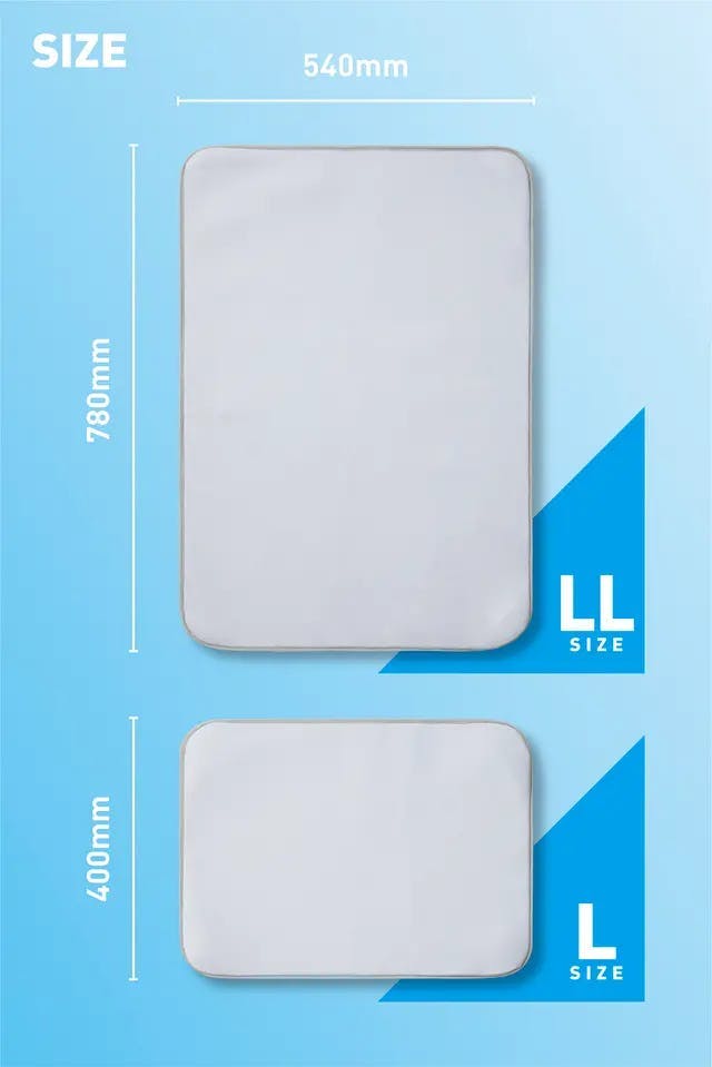 サイズはL、LLの2種類。LLサイズはLサイズの約2倍。高機能なバスマットではなかなか見当たらない、ゆとりある大きさです。大判で飛沫を受け止めやすいため、大切なお子様やペットを拭く際にも床を濡らしにくく、重宝するサイズではないでしょうか。