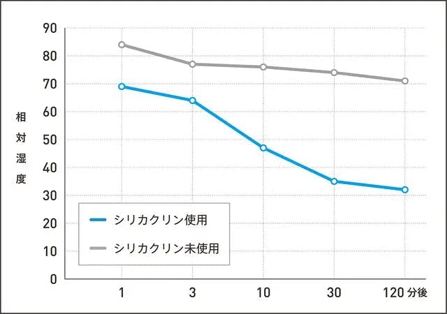 【 シルフィーノ 】は、湿度が高い時は湿気を素早く取り除き、過乾燥の時は放湿して最適な湿度に調整します。