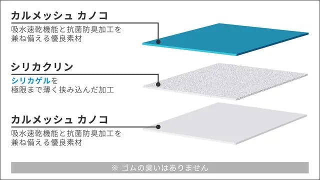 この3つのPOINTを支えているのは、“シリカクリン(シリカゲルシート)”を中心に“速乾・抗菌・防臭素材カルメッシュカノコ”で挟んだ、独自の3層構造です。発泡ウレタンに珪藻土を混ぜるタイプとは違い、ゴムの臭いはありません。