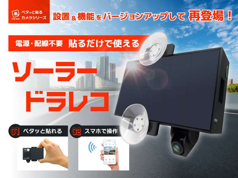 ペタッと張り付けるだけの簡単設置に加え、フロントガラスに貼り付けるからできるソーラー充電式のドライブレコーダーです。