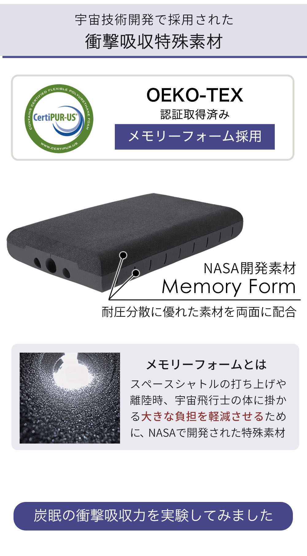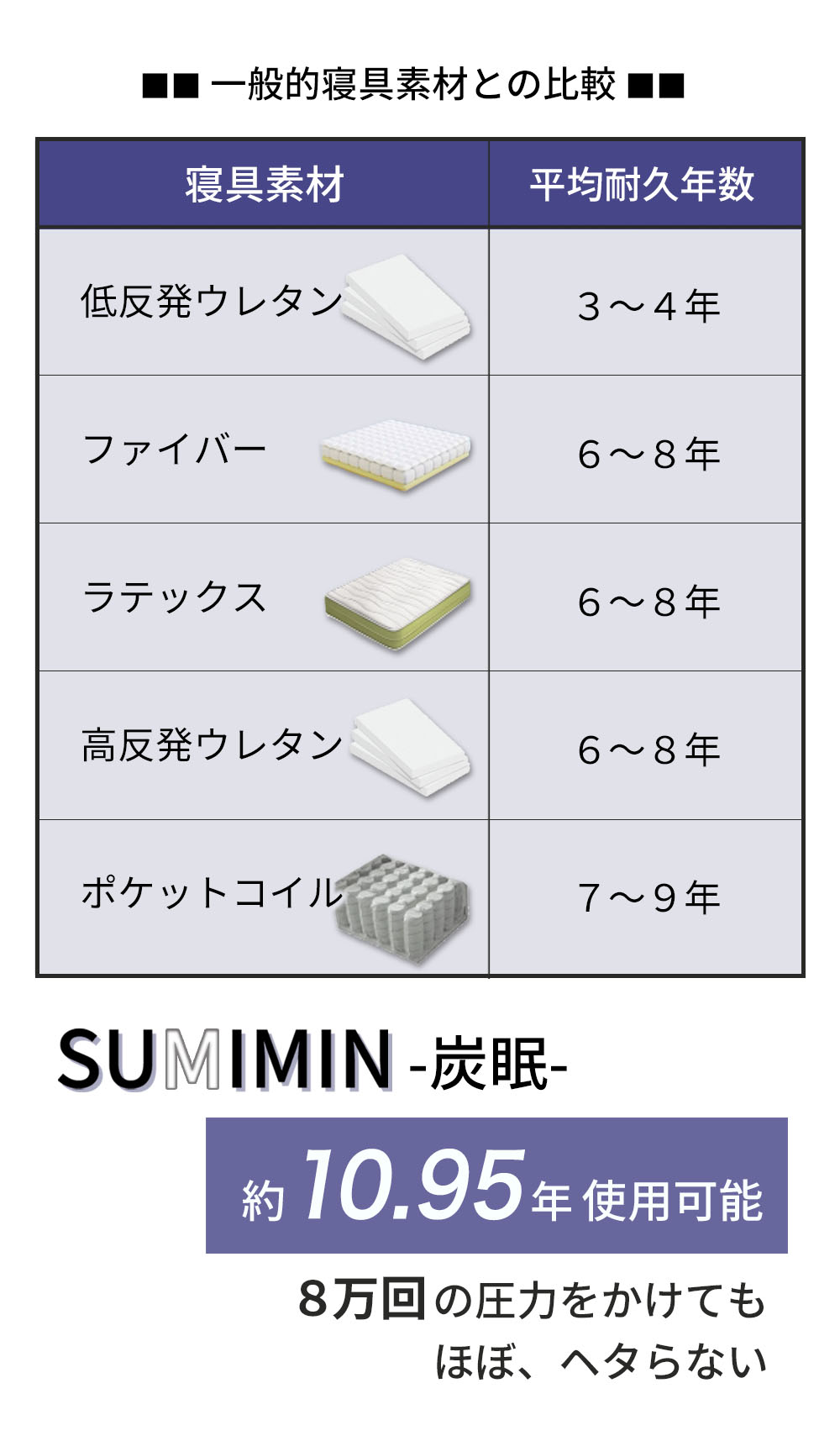 炭眠で採用されたウレタン素材「メモリーフォーム」は耐久性に優れており、約10年の耐久性を誇ります。