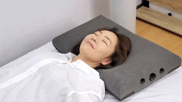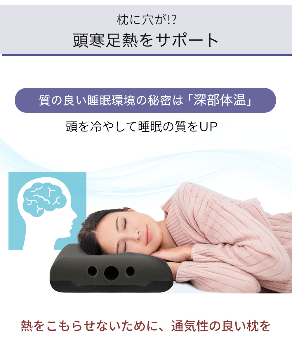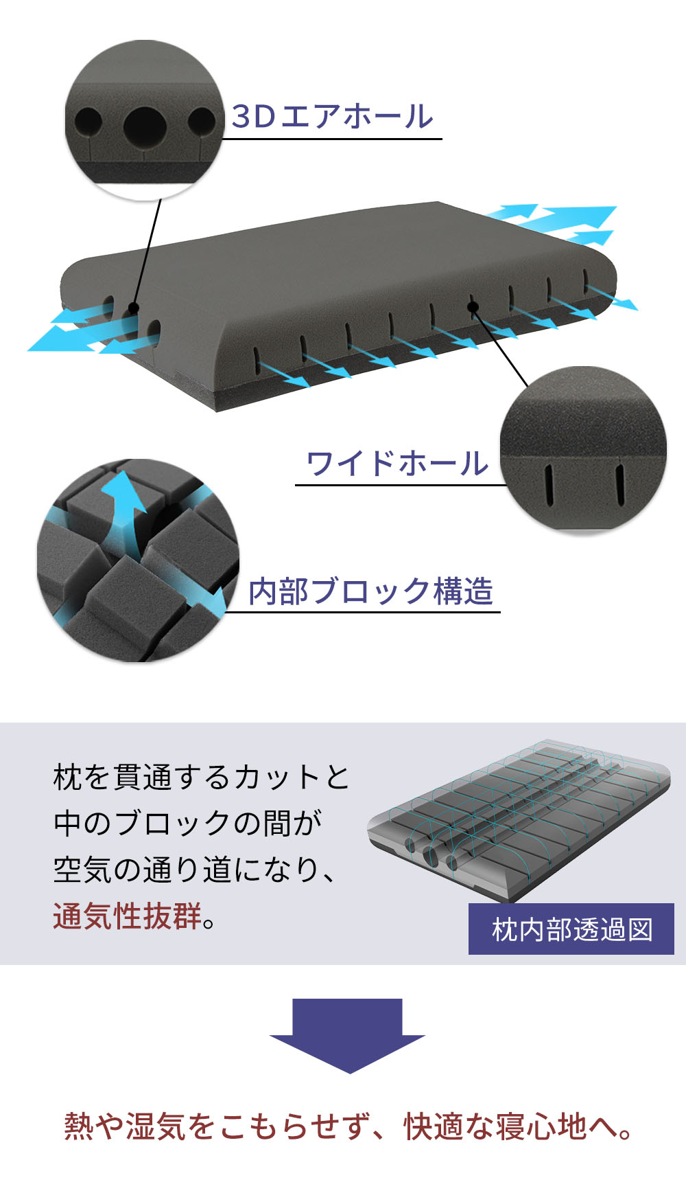 中央には3つの穴が枕のワイドを貫通するようにデザインされており、枕の中に大胆に空気の通り道を作り出します。