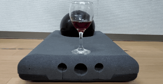 ワイングラスに衝撃が伝わっていないことがわかります。これは落ちた場所でしっかりと圧力を分散していることで、衝撃伝達が起きない状態になっています。