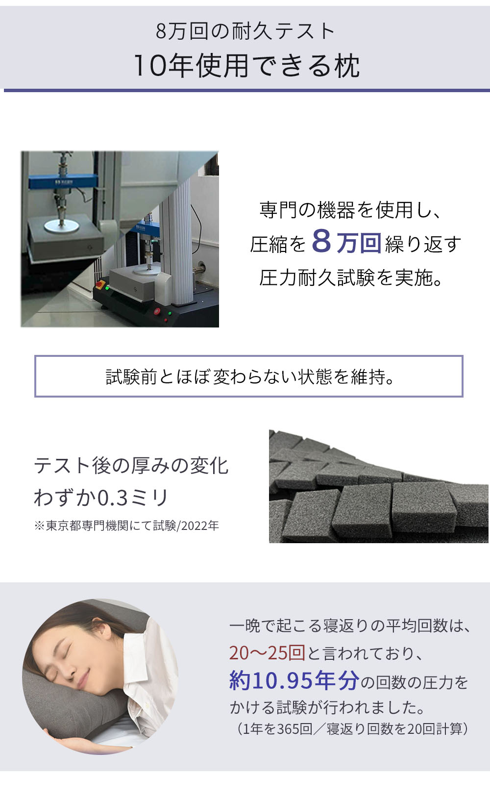 炭眠を使って、専門機関にて耐久テストを実施、『8万回の圧縮を行うテスト』を行いました。8万回圧縮された炭眠の厚さを測ってみると、テスト後の厚さの変化は、わずか約-0.3mmしか変わりませんでした。