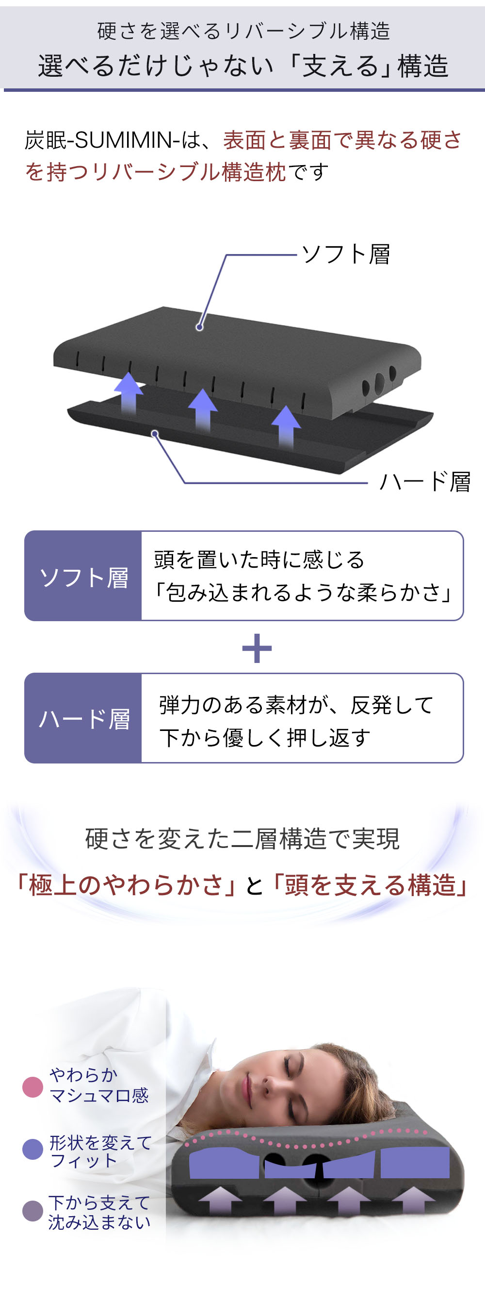 リバーシブル構造には硬さを選択するだけではなく、硬さのあるハード面が枕にかかる重力に対し反発し押し返すことで、枕に頭をつけたときは「包み込まれるような柔らかさ」を感じ、睡眠時間中、沈み込みすぎずしっかり支える構造になっています。