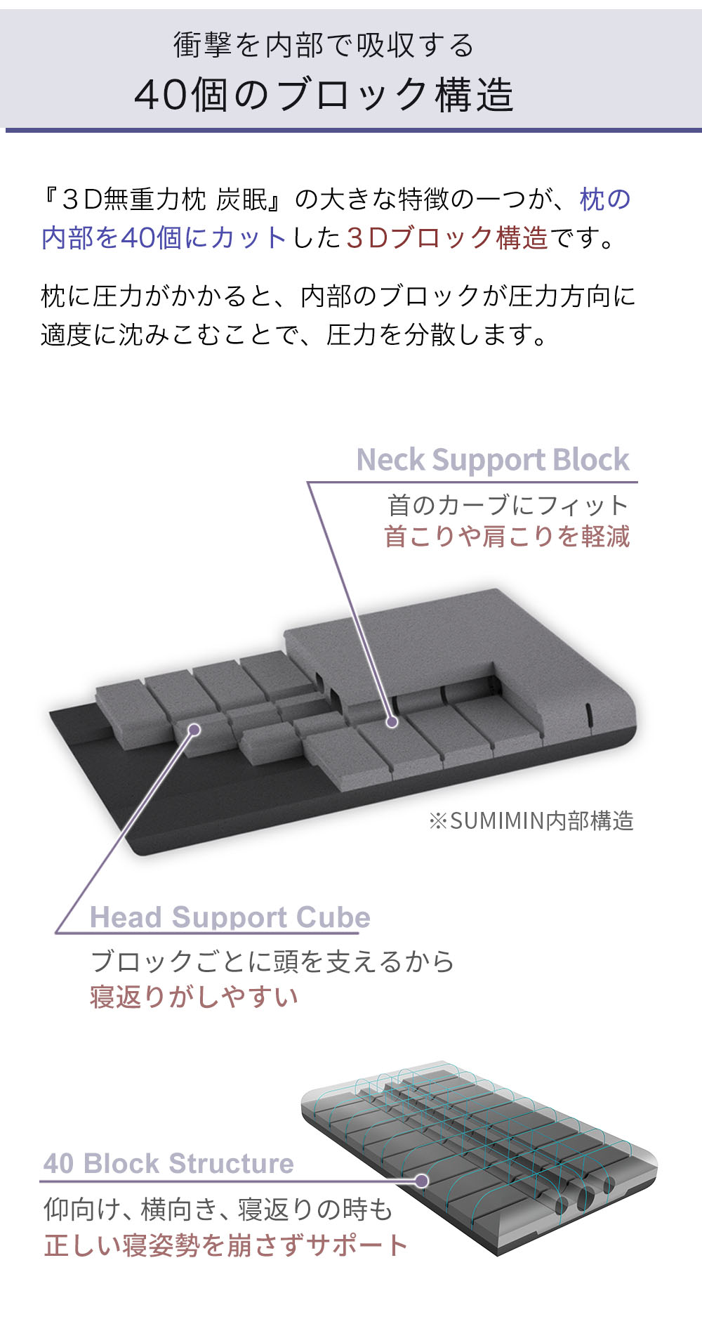 炭眠-スミミン-のブロックカット構造は、首や肩に触れる部分はしっかりと首のカーブを作り出すように、大きめのサイズに。細かく動く頭部は小さなブロックカットを行うことで、睡眠中の多様な動きでも、しっかりと圧力を分散します。
