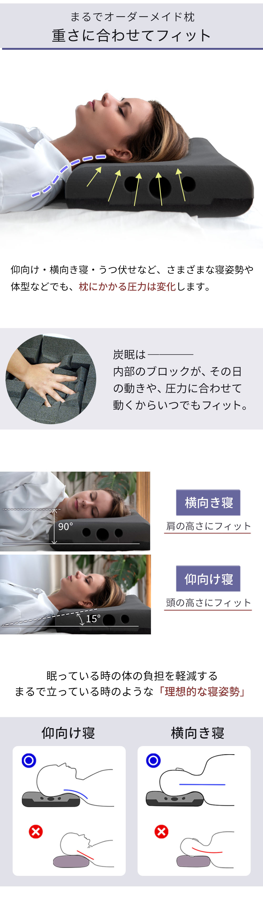 炭眠は、枕にかかる圧力に応じて内部のブロックが沈みこむため体型や寝姿勢に合わせて枕が快適な高さに合わせる「オーダーメイドのような枕」です。