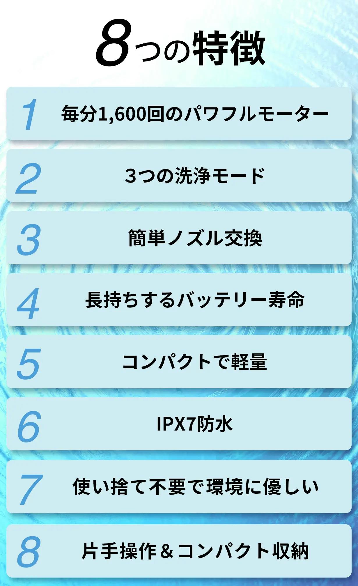 最新のエアポンプ技術により、最大140 PSI、毎分1,600回の強力な水流が、食べかすや歯の表面の汚れを瞬時に洗い流します。コンパクトながら、本格的のパワーを体感できます。