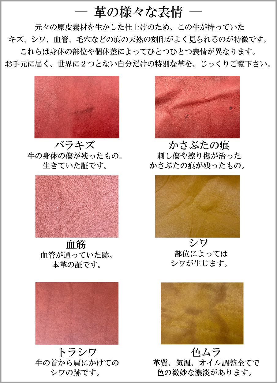 デッドストック革の解消を目的としているため、多少のキズやシワ等の部分はサイドや底など目立ちにくい箇所に使用している場合がございます。