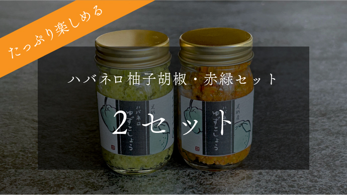 お試しで赤と緑のハバネロ柚子胡椒を1本ずつ、計2本のセットです。食べ比べを楽しんでください!