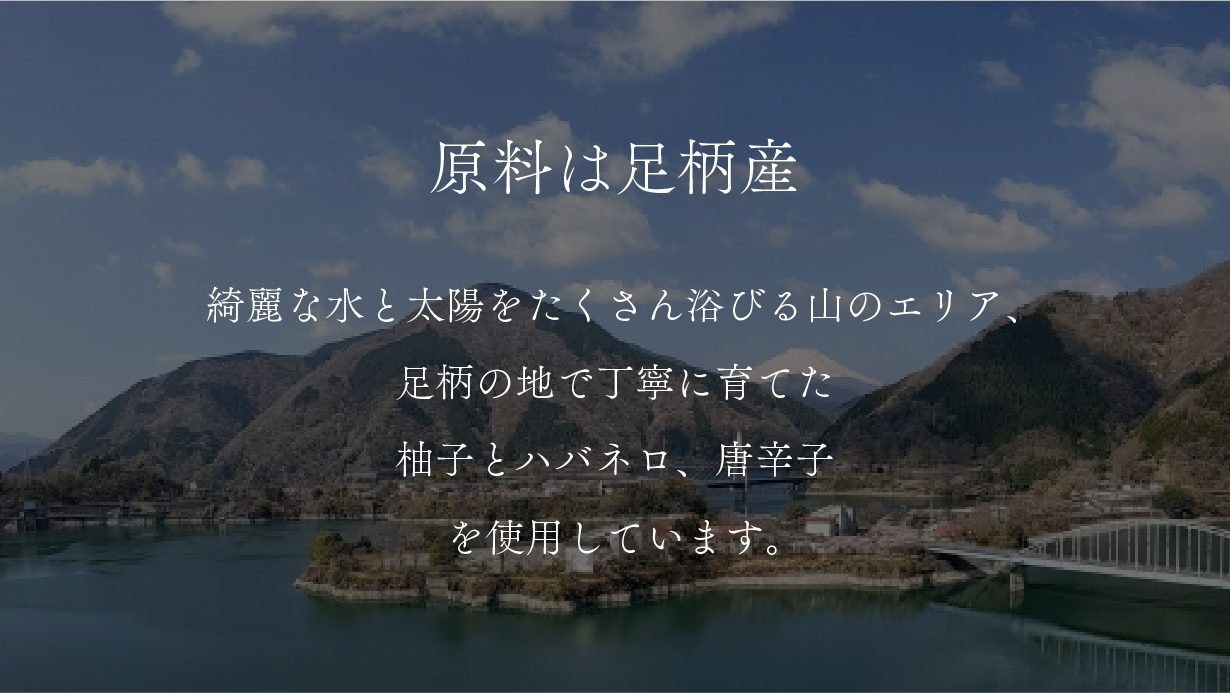 綺麗な水と、太陽をたくさん浴びる山のエリア、足柄の地で丁寧に育てた柚子とハバネロ、唐辛子を使用しています。