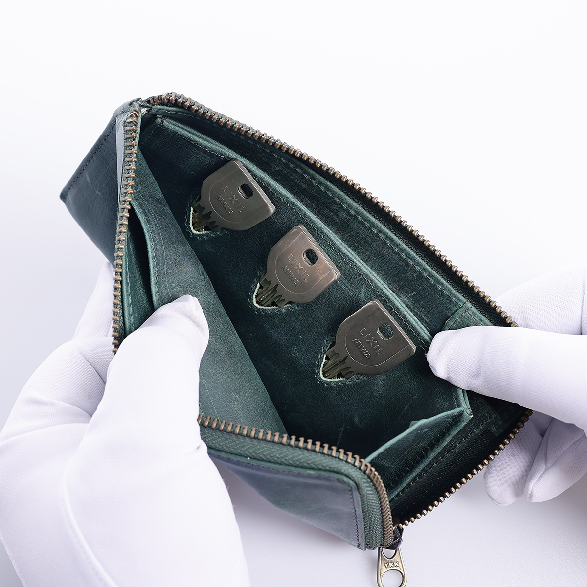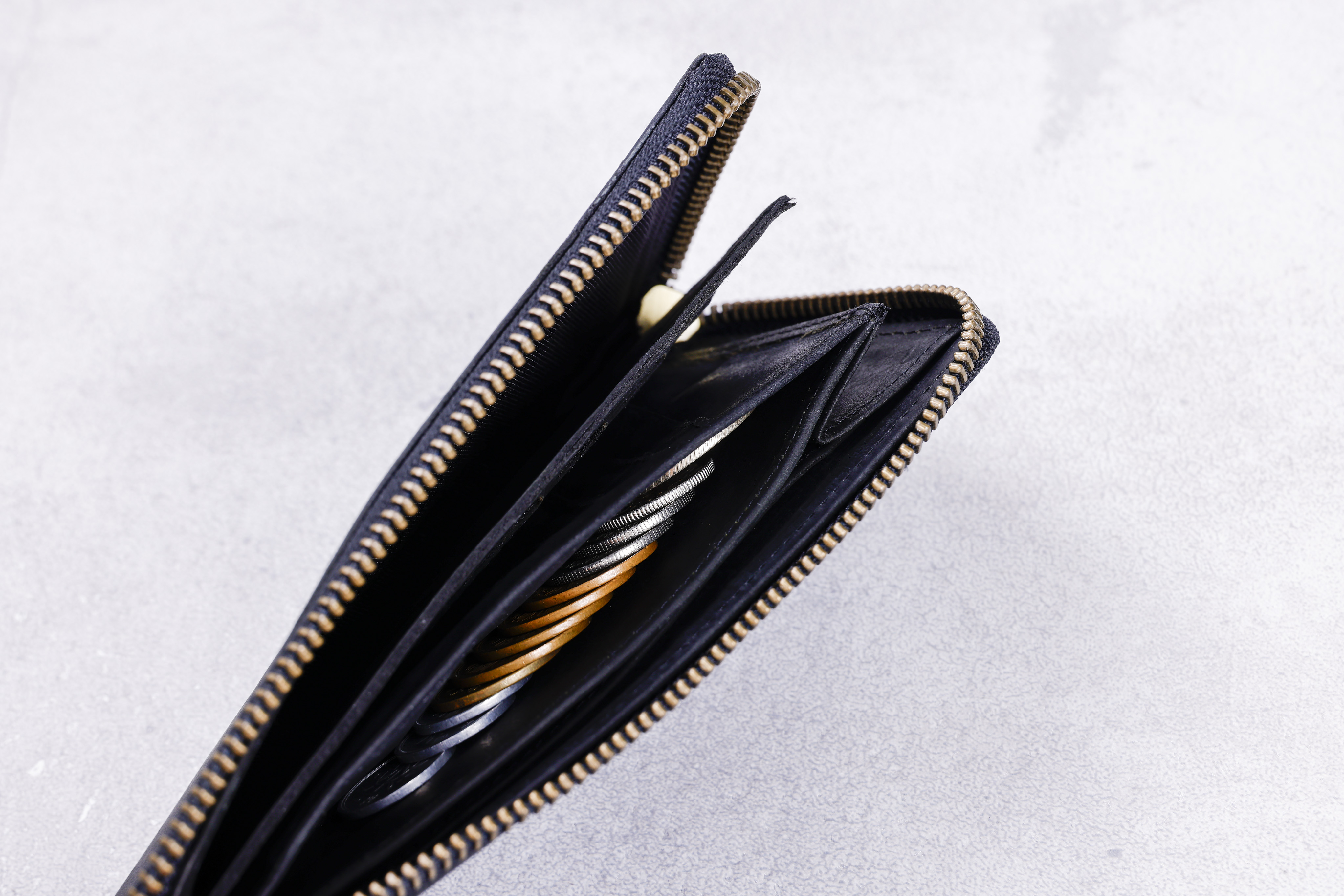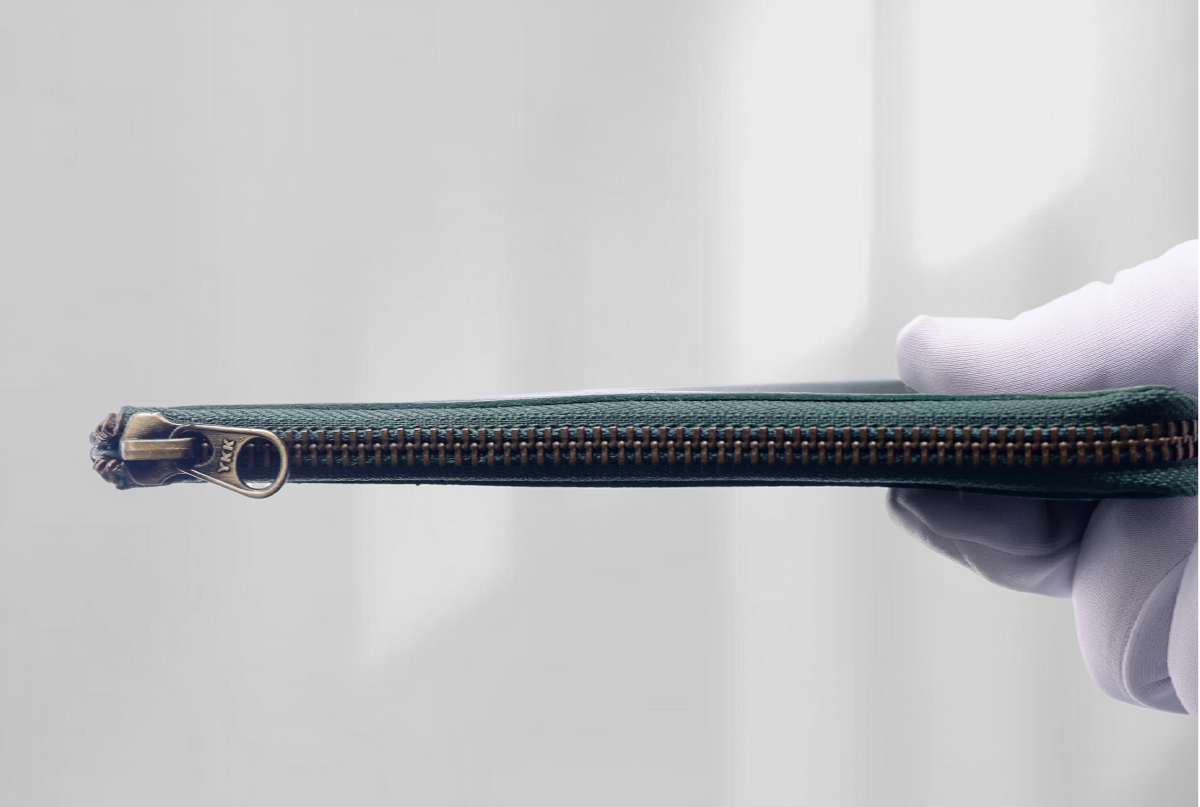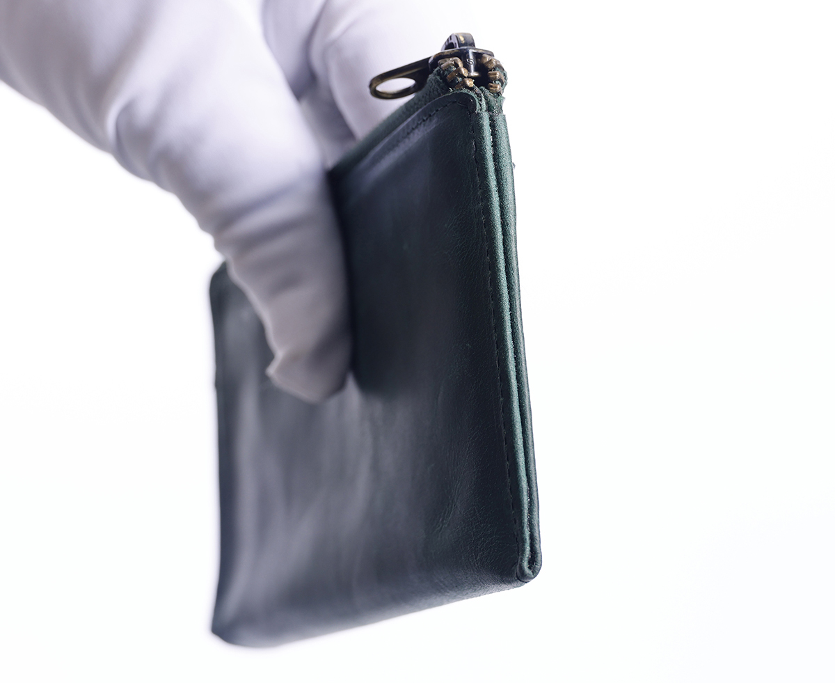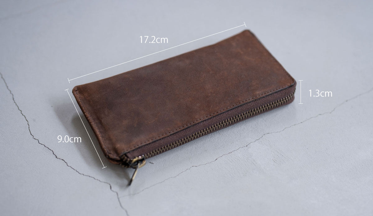 特にこだわったのがサイズ精度です。一万円札を折らずに美しく収めることを前提とし、ファスナータイプの長財布としては、紙幣との干渉を避けるほぼ最小のサイズまで設計を研ぎ澄ませています。