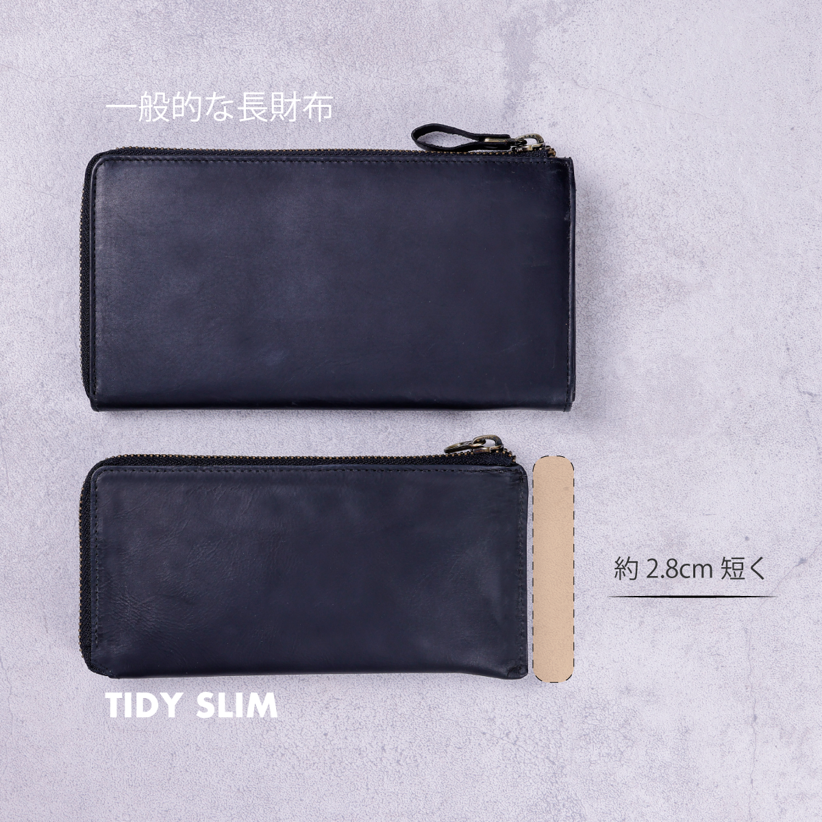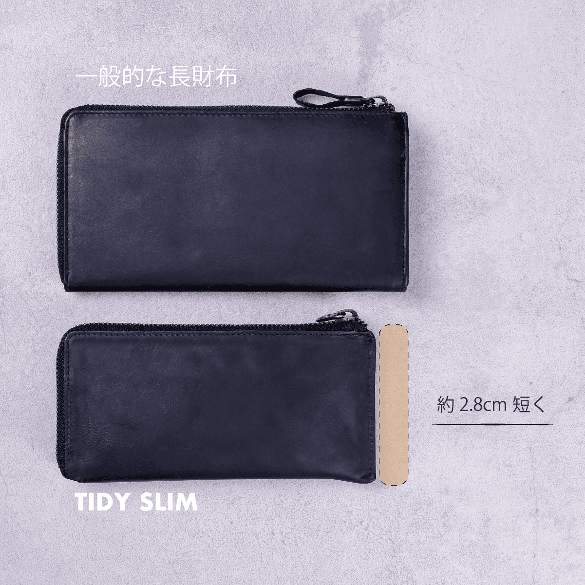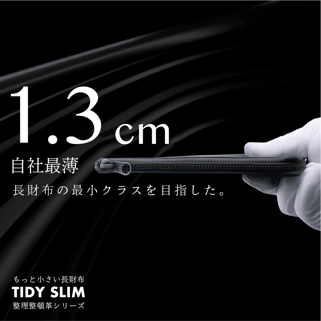 TIDY SLIMは、整理整頓のしやすさをそのままに、「薄く、小さく」を極限まで追求した最新モデルです。従来の長財布のイメージを覆すスリムボディの中に、必要なものをすべてスマートに配置できる収納設計を凝縮。