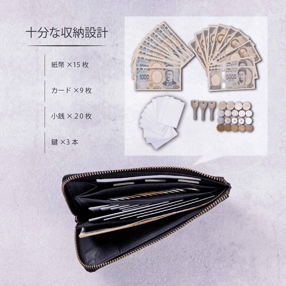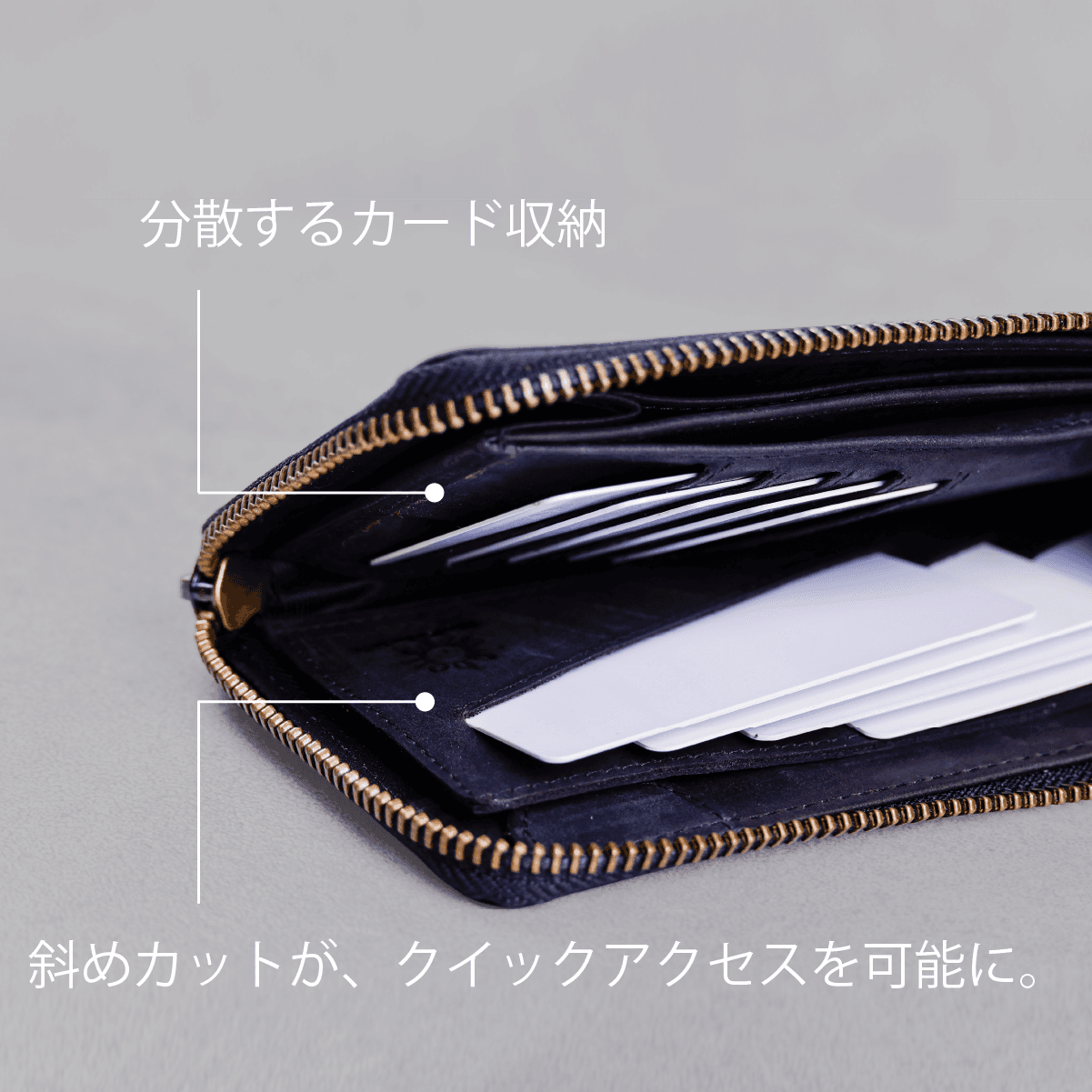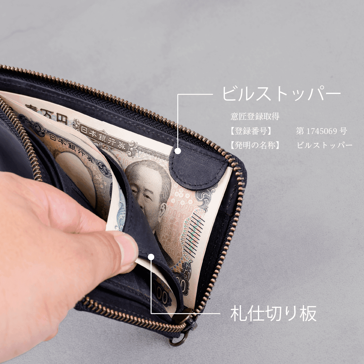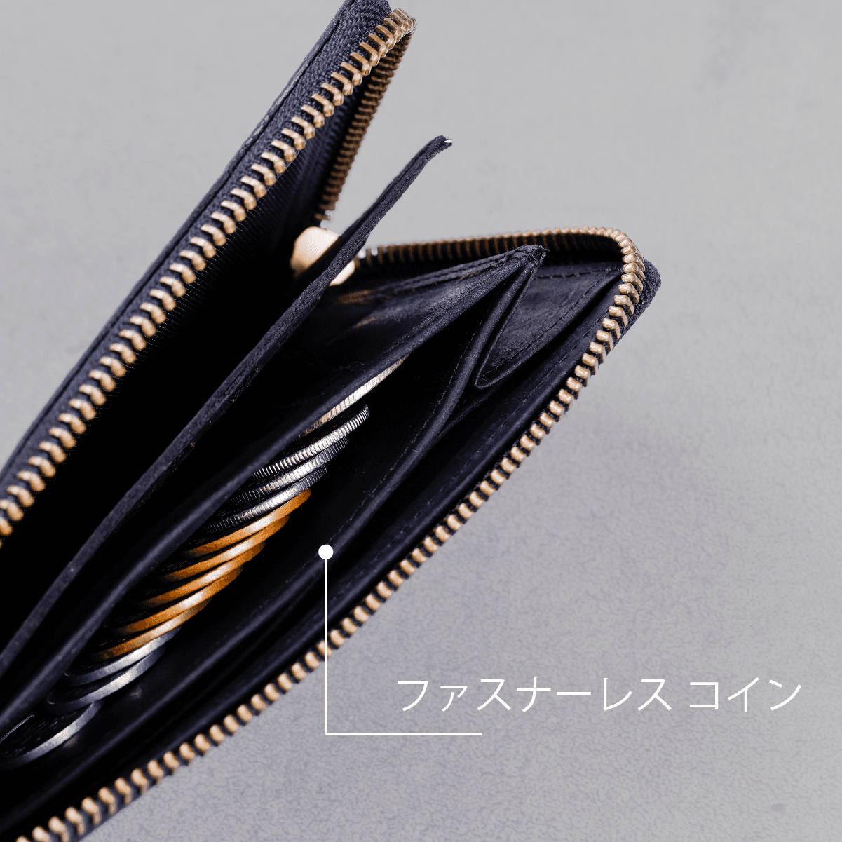 この細部にわたる工夫により、長財布でありながら、ポケットに収まりやすい最小クラスの幅を実現。一切の無駄を排除し、スマートな携帯性を追求しました。
