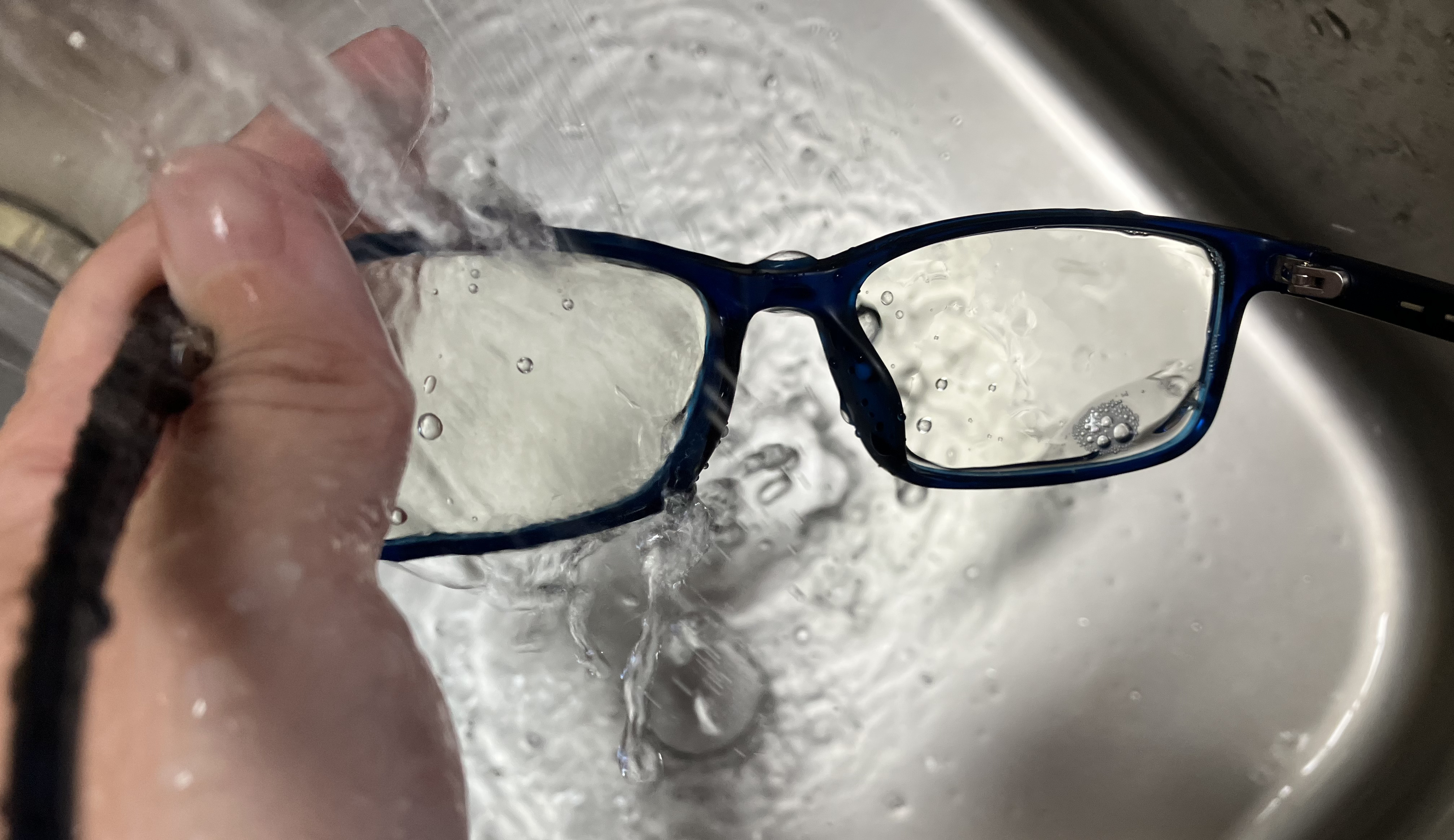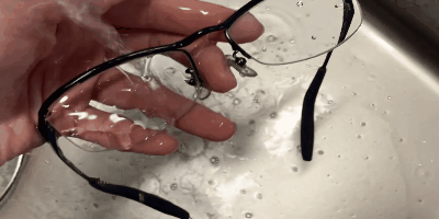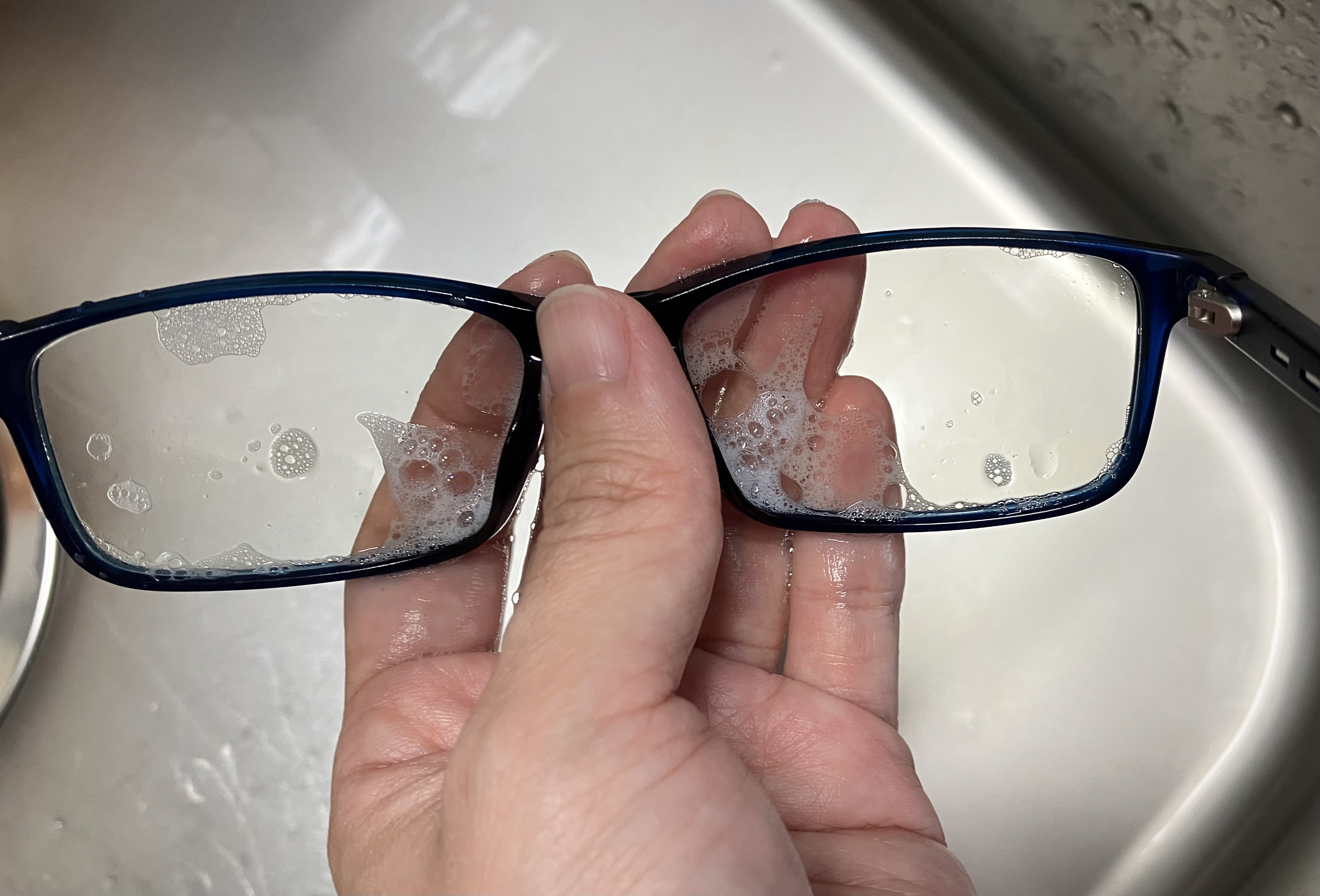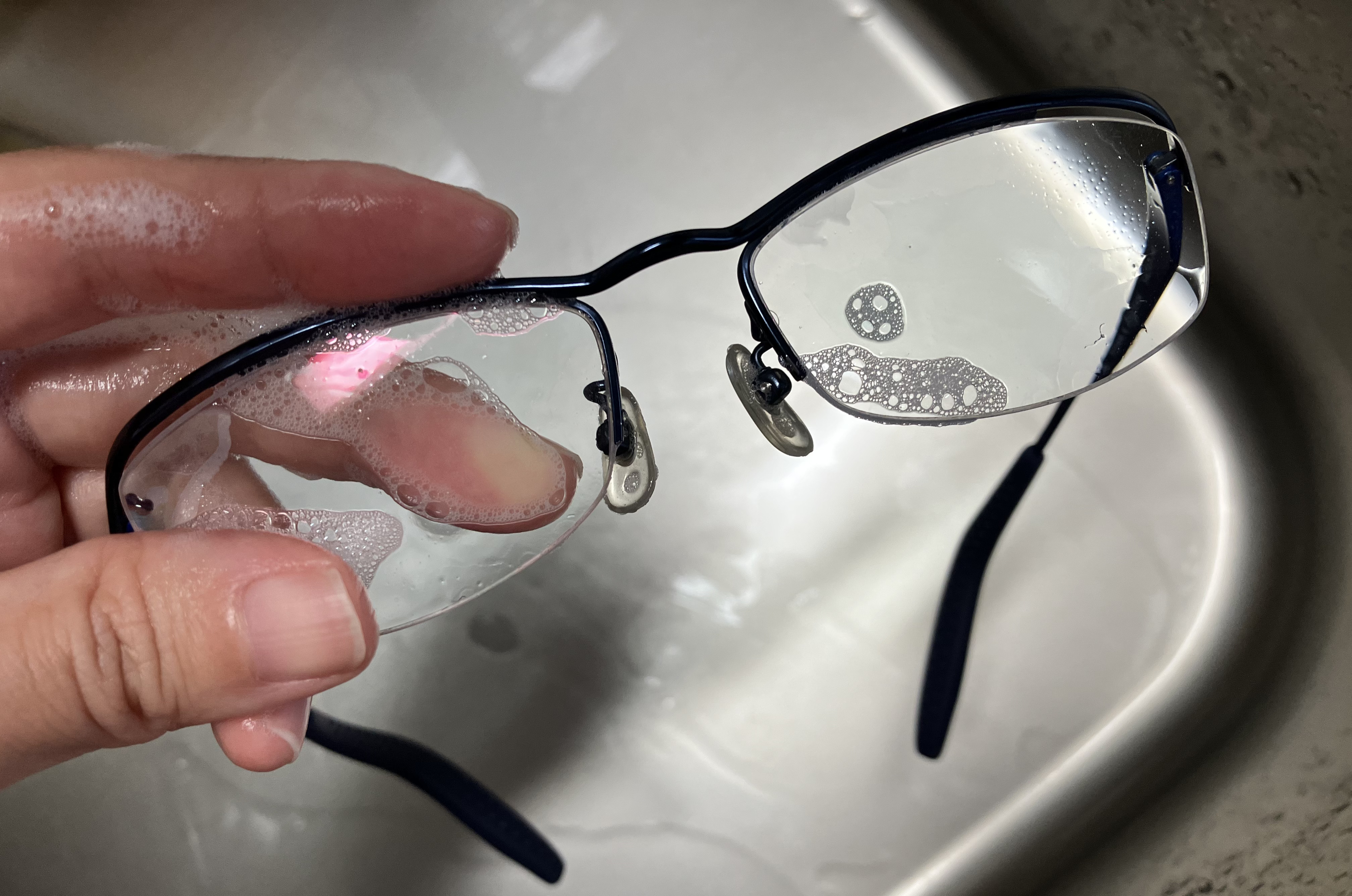 ①中性洗剤でレンズをやさしく洗い、水で洗い流す。※お湯ではなく水です