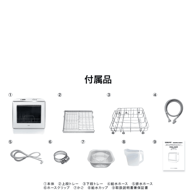付属品:上段トレー、下段トレー、給水ホース、排水ホース、ホースクリップ、かご、給水カップ、取り扱い説明書(保証書)