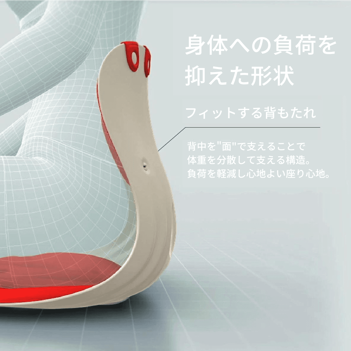 これらのサポートによって体重を分散して支え、負担の少ない姿勢でラクに座ることが可能です。
