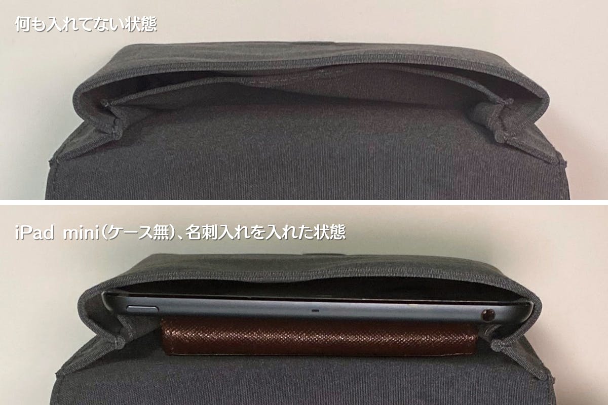 B6手帳やミニタブレット(iPad miniと同等のサイズ。下記、内寸サイズは事前にご確認ください。)にベストなポケットがあります。さらに内側にはミニ財布や名刺入れなどが重ならずに収納できるポケットも。(正面から見て上部にあります)