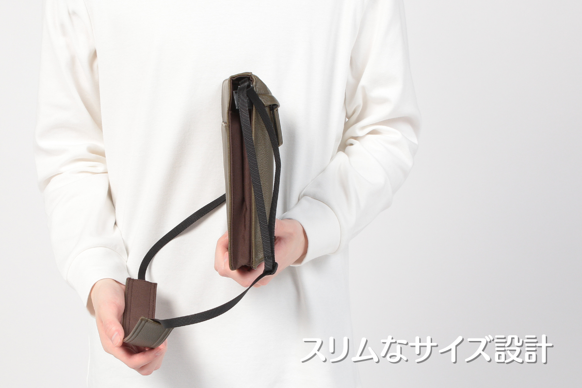豊富なポケットで十分な収納機能がありつつも、スリムなデザインです。また、突然の雨や小降りの雨で一時的に少量の水にさらされても、ショルダーポーチの中のものが濡れにくい設計仕様となっております。