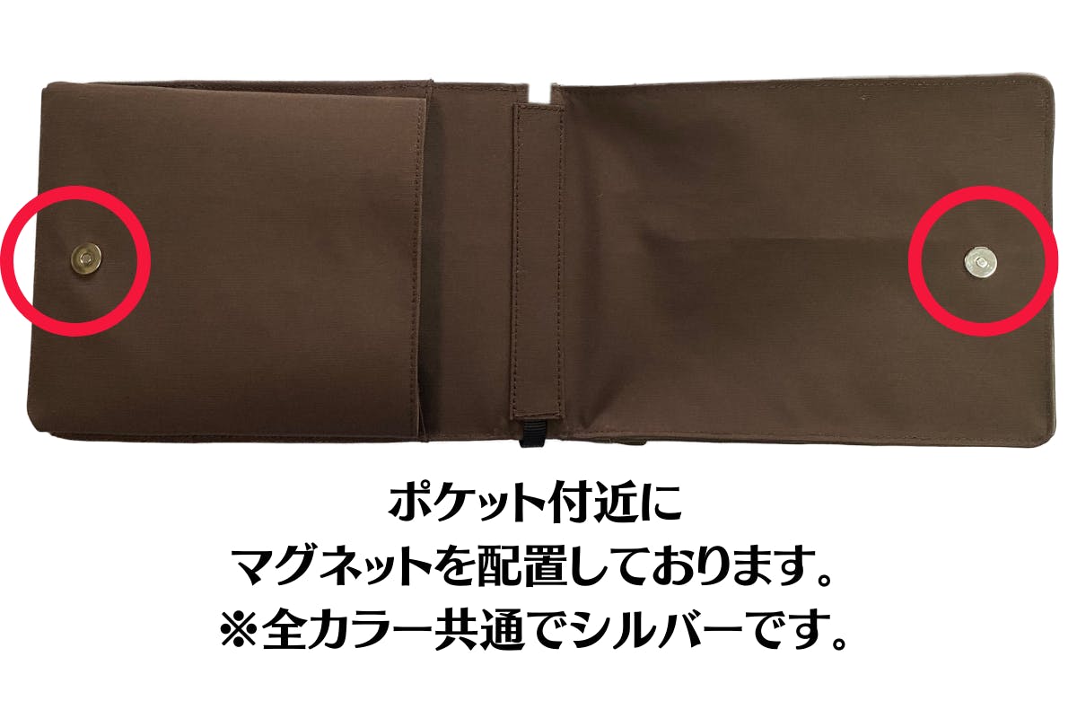 ※本製品はメインポケットの前面下部に、マグネットを配置しております。そのため、この部分に対し、直接、磁気カード(クレジットカード等)を近づけないように、ご注意ください。