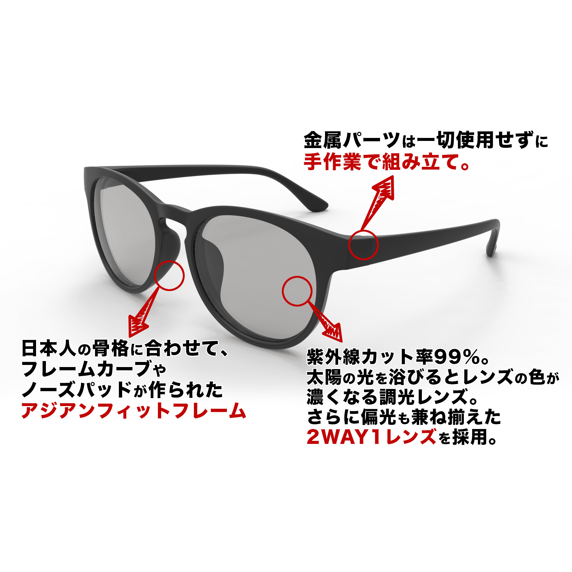 メガネの鯖江発、偏光・調光・UVが1つに!金属パーツ不使用、再生ペットのアウトドアサングラス