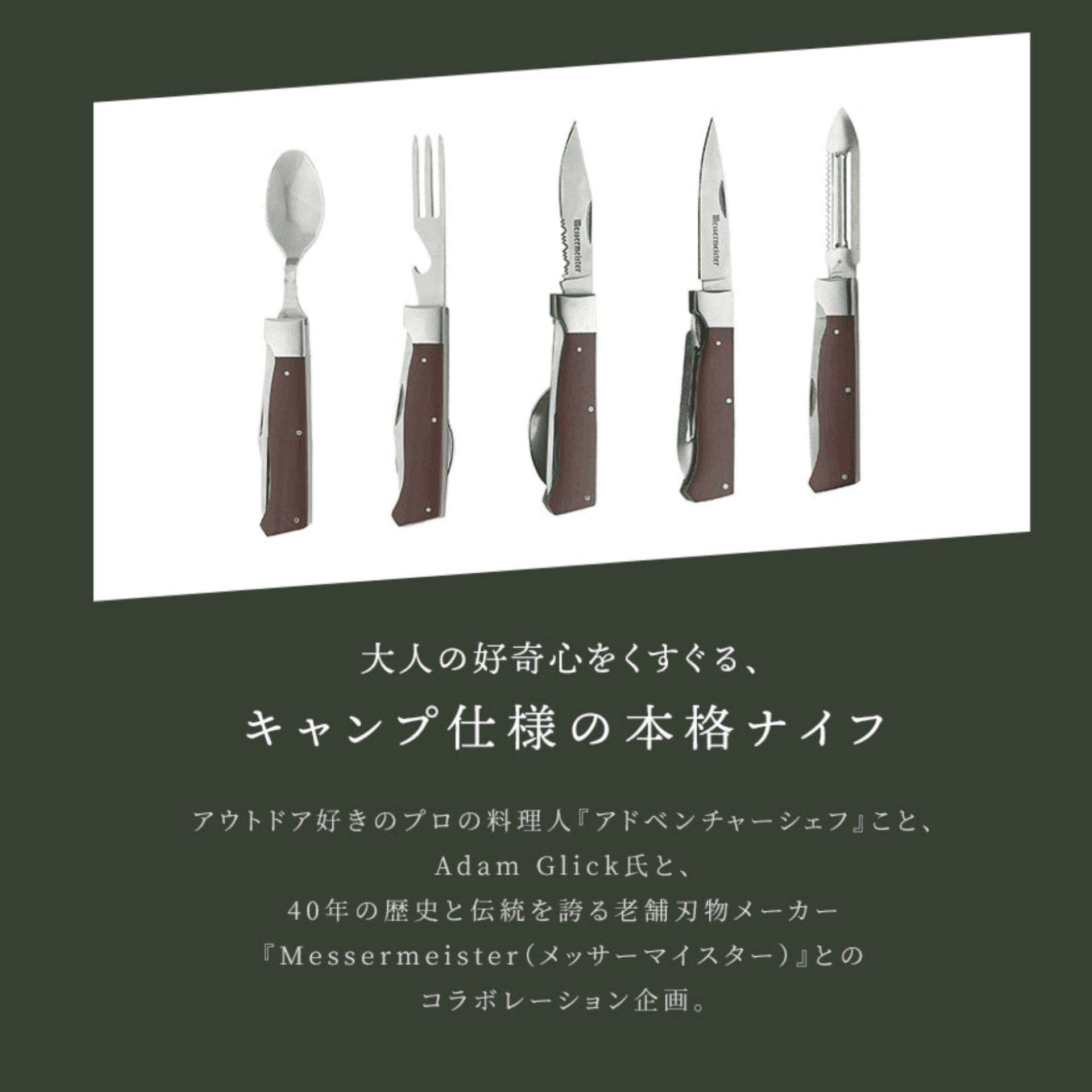 『Adventure Chef Collection』はアウトドア好きのプロの料理人『アドベンチャーシェフ』こと、Adam Glick氏と、40年の歴史と伝統を誇る老舗刃物メーカー『Messermeister(メッサーマイスター)』とのコラボレーション企画から生まれた商品。