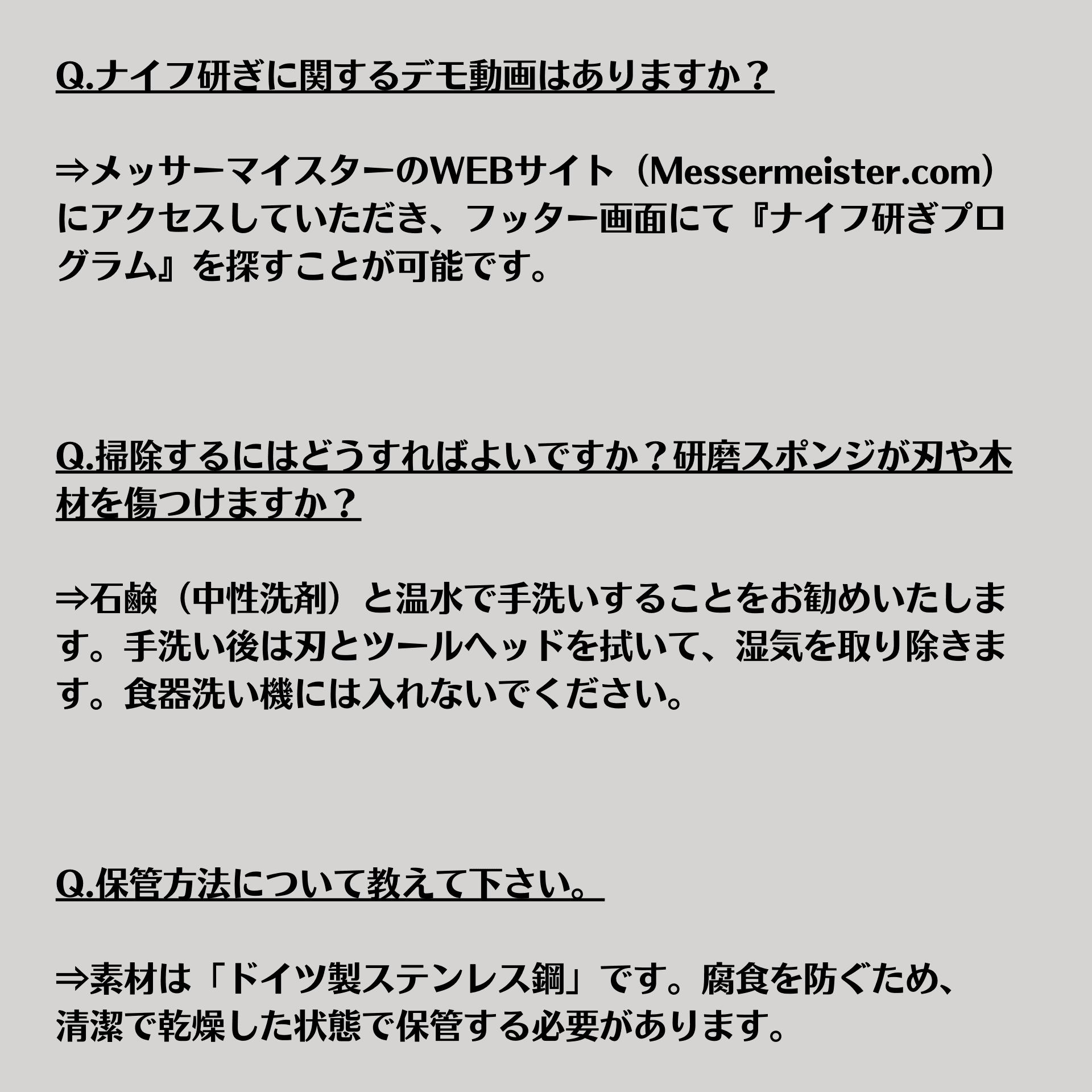 A.メッサーマイスターのWEBサイト(Messermeister.com)にアクセスしていただき、フッター画面にて『ナイフ研ぎプログラム』を探すことが可能です。