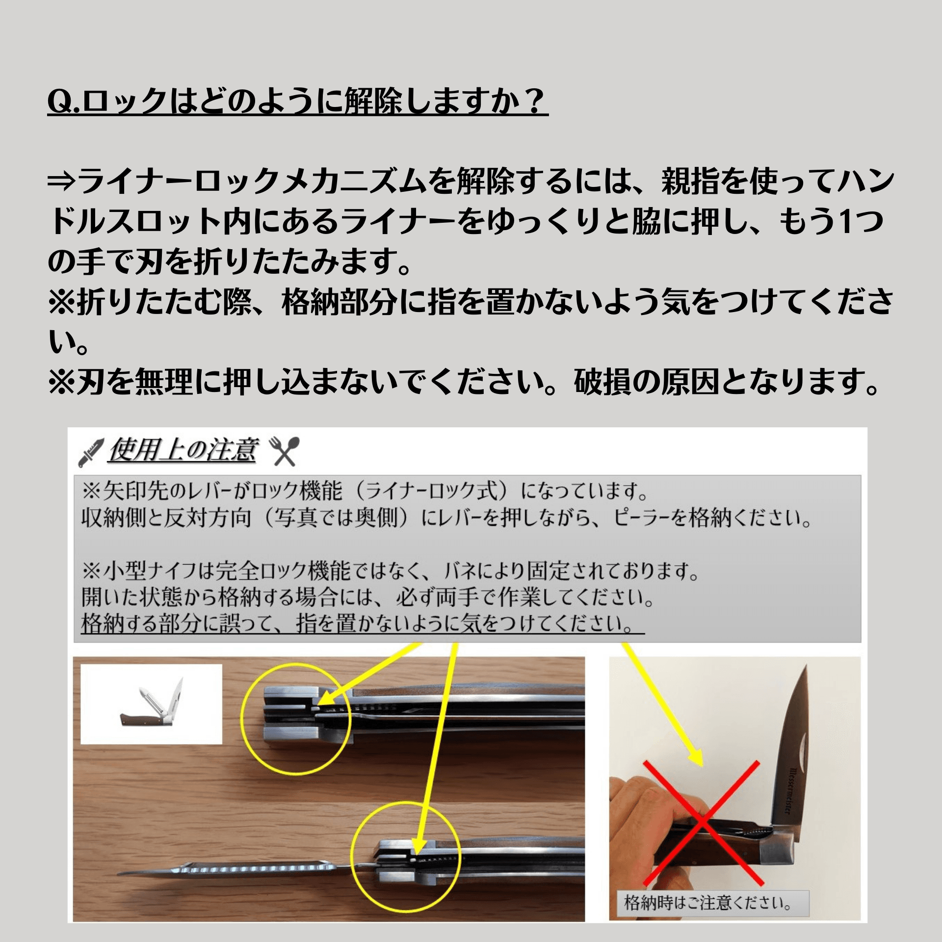 本製品(折りたたみ式ナイフ)は刃渡り8cmを超えるため、銃刀法の適用製品となります。キャンプ場などでの適切な使用においてのみ適法となり、不用意な所持は取締の対象になる場合がございます。したがって、キャンプ場などへ持ち運ぶ際は厳重に梱包し、ナイフがむき出しの状況にならないようご注意ください。またバッグや自動車等に入れっぱなしという状態は正当な理由での所持にならないため、厳重にご注意ください 。
