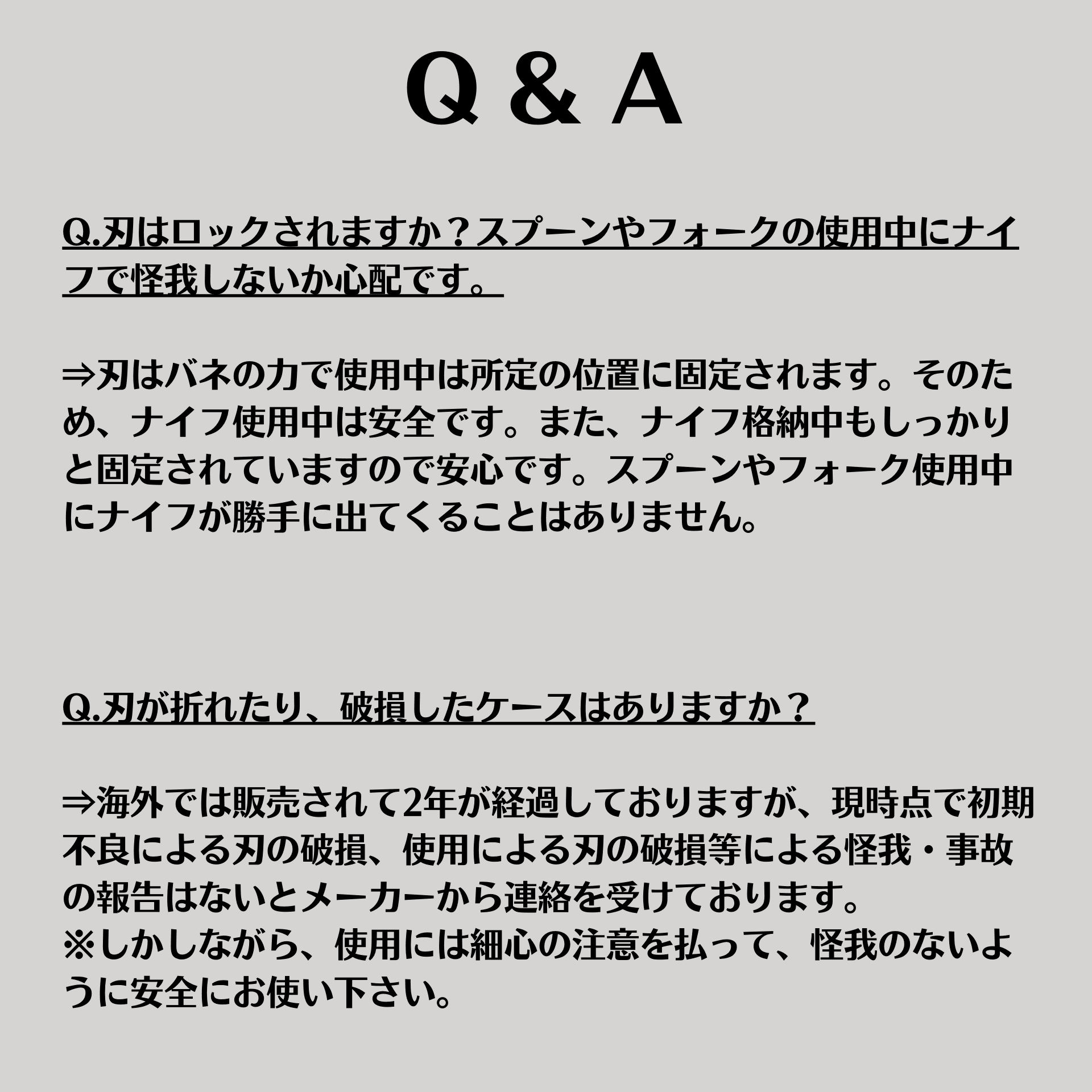 A.刃はバネの力で使用中は所定の位置に固定されます。そのため、ナイフ使用中は安全です。また、ナイフ格納中もしっかりと固定されていますので安心です。スプーンやフォーク使用中にナイフが勝手に出てくることはありません。