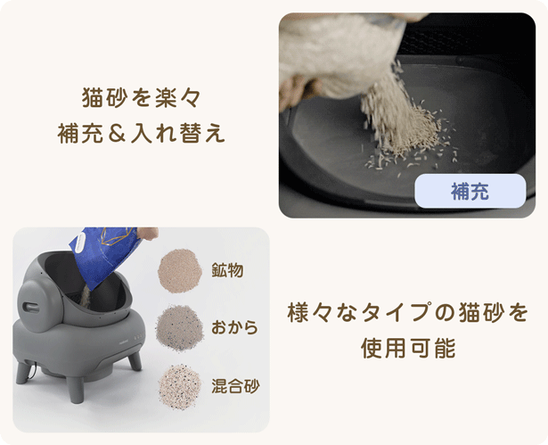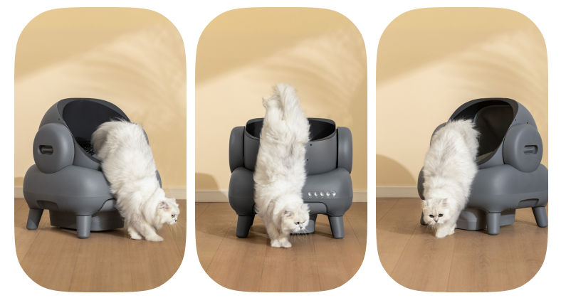 猫の出入りを感知する高精度センサーを搭載しており、猫がトイレから出ると自動的に排泄物の掃除を開始。ゆっくりと回転して、固まった猫砂と排泄物をゴミ箱へ振り分けます。