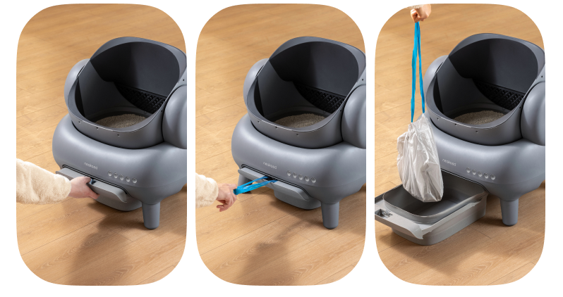 ゴミ箱にたまった排泄物は、トレーを引き出して、ゴミ袋の紐をギュッと引いて口を閉じ、ポイッと捨てられます。手を汚さずに猫砂を処理することが可能です。