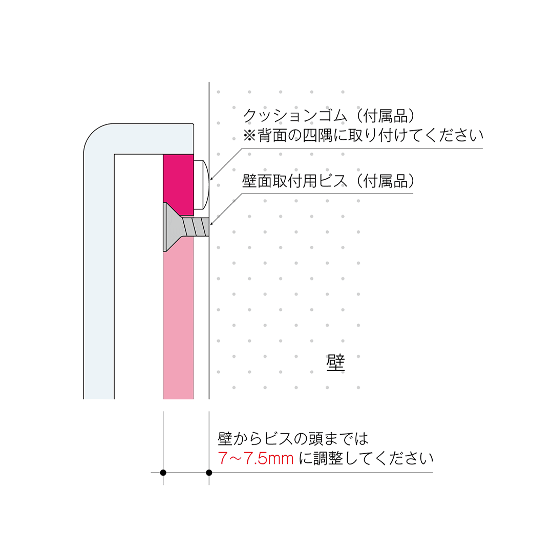 ・壁面の下地がある場所にビスを取り付け、壁からビスの頭までを7~7.5mm内にしてください。
