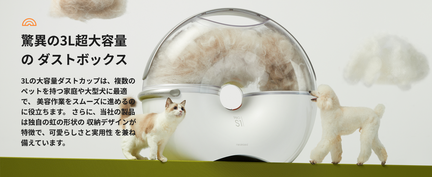 【3Lの超大容量ダストボックス搭載】ユニークな虹の形のゴミ箱は3リットルの容量を提供し、同時にコンパクトで軽量なデザインを保持しています。多頭飼いも心配なし,グローミング中に頻繫にゴミ捨てる必要がないし、作業がスムーズに進められます。