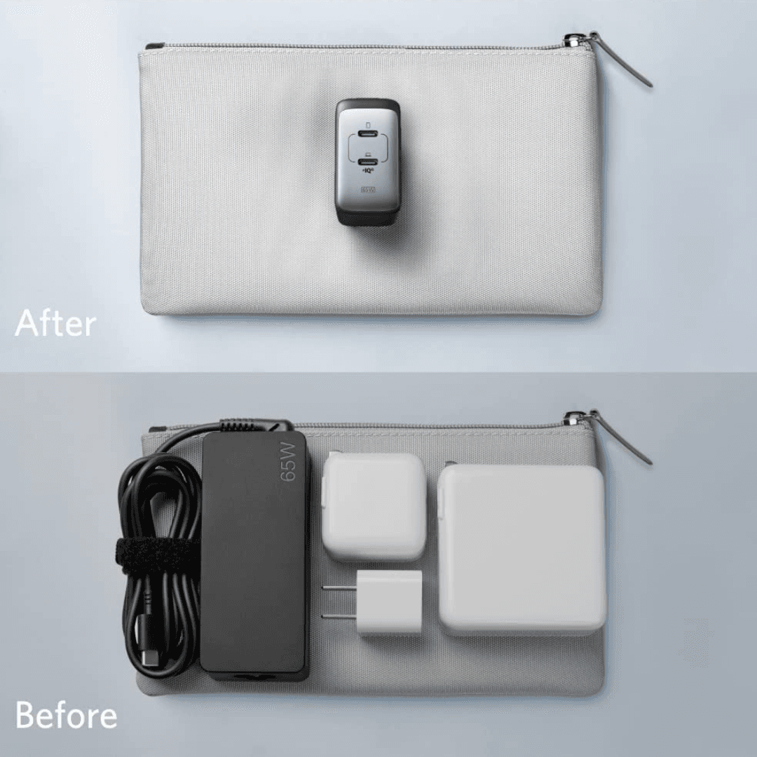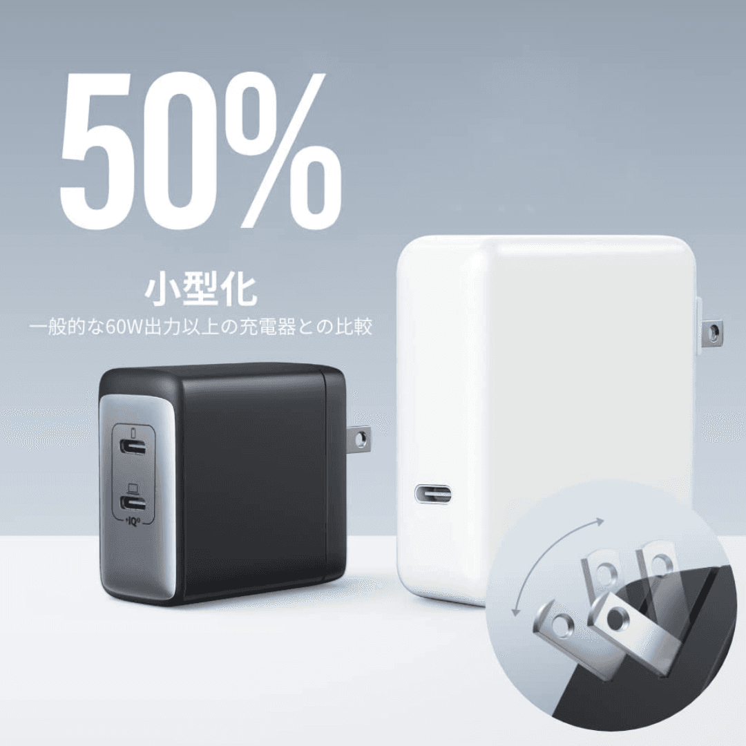 一般的な60W出力以上の充電器に比べ、約50%小さなコンパクトサイズを実現。